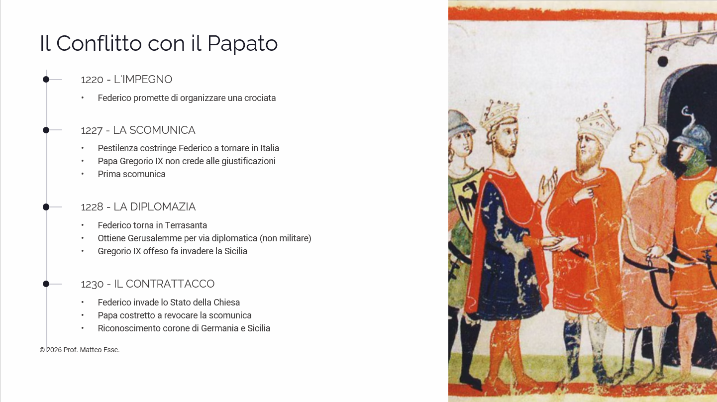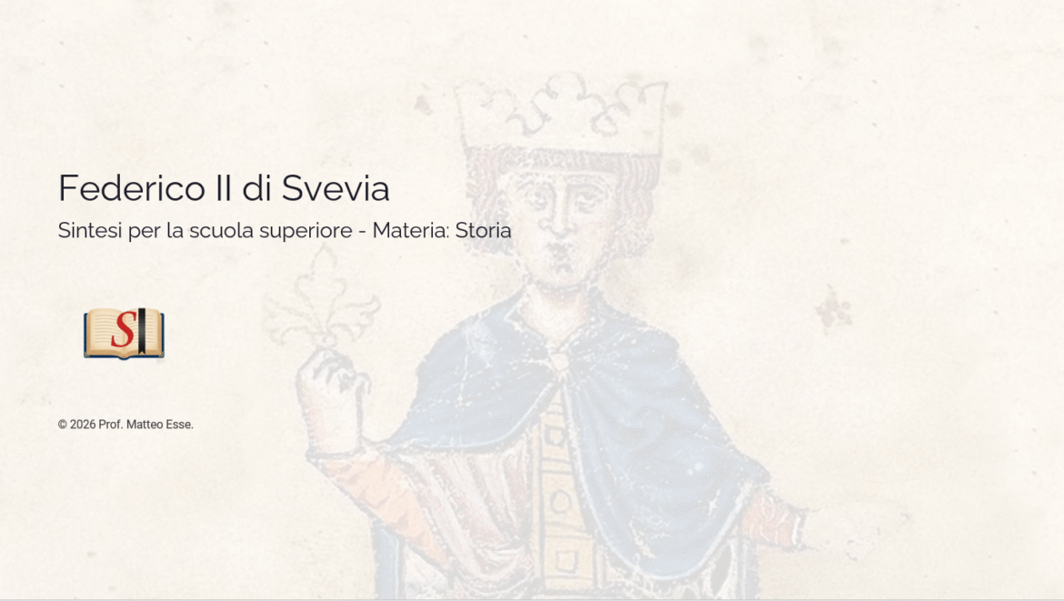 Questo kit didattico analizza la figura di Federico II, unendo l’aspetto politico (lo scontro con i Comuni e il Papato) a quello culturale (la Scuola Siciliana e la corte di Palermo). Il materiale è progettato per circa 90-120 minuti di attività ed è interamente modificabile (PPTX).