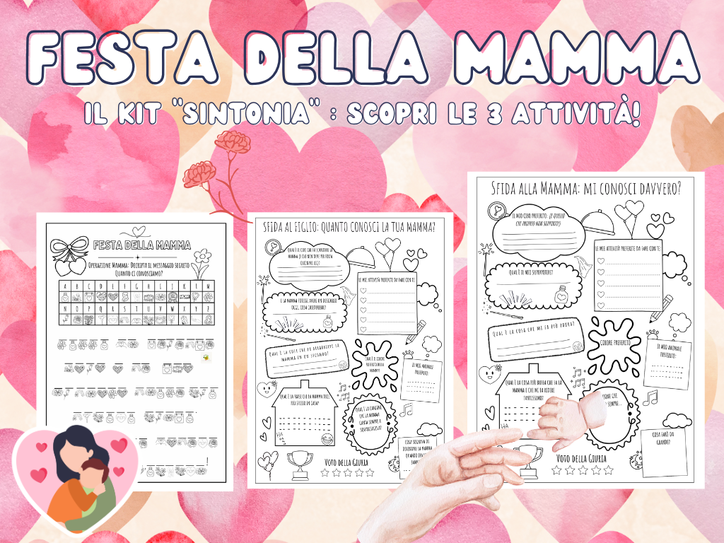 Speciale Festa della Mamma: Il Kit “Sintonia” 💖 Ogni anno, come maestre, ci mettiamo alla ricerca dell’idea perfetta: il materiale più innovativo, la tecnica più particolare o il lavoretto più scintillante da consegnare. Quest’anno, però, io ho scelto di tornare all’essenziale per festeggiare tutte le mamme: la semplicità della carta e la potenza delle parole. 3 schede didattiche: 💖Mettiti alla prova con la Sfida al Figlio: scopri se il tuo bambino conosce davvero i tuoi gusti, dal tuo piatto preferito a ciò che ti fa ridere di più! 💖 Inverti i ruoli con la Sfida alla Mamma: tocca a te dimostrare quanto conosci i sogni, i segreti e le piccole passioni del tuo tesoro. 💖 Svela il Messaggio Segreto: divertitevi insieme a decodificare i simboli per scoprire la dedica speciale nascosta tra i cuori e i fiori di questo magico gioco!