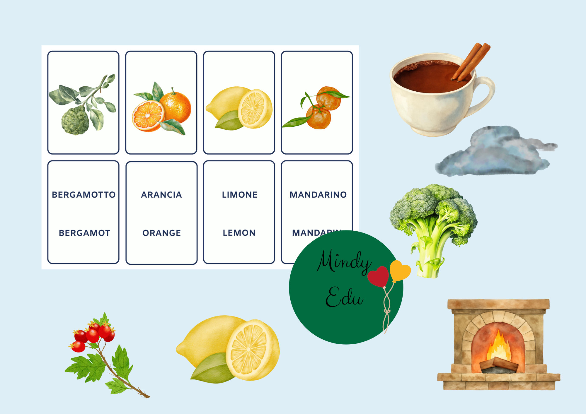 Ogni foglio A4 orizzontale contiene 4 flash cards ( immagine sopra+ testo in inglese e italiano sotto- dimensione singola: circa 6,6 cm × 7,4 cm), ideali per attività didattiche, giochi di associazione e decorazioni stagionali.