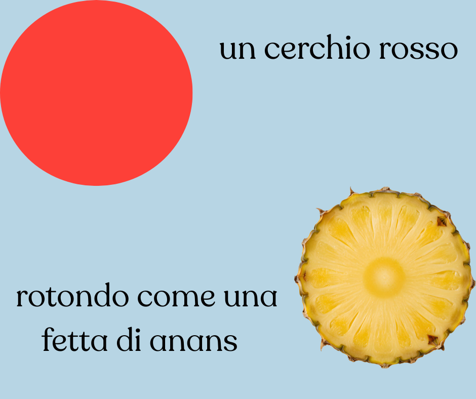 Una raccolta di 60 schede di forma quadrata su sfondo bianco, 30 immagini + 30  testo. La raccolta è composta di una serie di immagini collegate tra loro che, partendo da un cerchio rosso, un quadrato blu, un rettangolo giallo, un triangolo verde, un rombo arancio, propone un’oggetto dello stesso colore, e una serie di oggetti con la stessa forma.