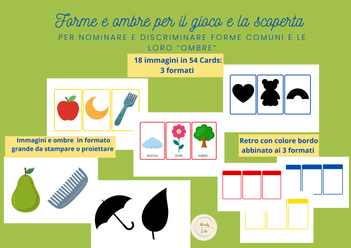 La raccolta si compone di 54 Cards di circa 9×12 cm in 3 formati diversi: · Bordo giallo: solo immagine, · Bordo rosso: immagine con nome, · Bordo blu: “ombra” dell’immagine. Nelle cards sono rappresentate forme note ai bambini e molto semplici, e forme di oggetti più complessi, di cui è facile discriminare l’ “ombra”. Le forme della raccolta sono: cuore, sole, luna, stella, nuvola, arcobaleno, fiore, casa, palla, albero, foglia, mela, pera, fragola, orsetto, pettine, ombrello, forchetta. Prima di proporre questo materiale ai bambini, consiglio, come nelle raccolte “A CIASCUNO LA SUA OMBRA” e “30 ANIMALI COMUNI, A CIASCUNO LA SUA OMBRA” , di accompagnarli nella scoperta e nel riconoscimento delle ombre attraverso un’esperienza reale. È possibile utilizzare una torcia, anche quella dello smartphone e le forme proposta in questa raccolta, nel formato grande, ritagliate con precisione. Perché l’esperienza sia significativa è importante organizzare l’esperienza in modo che sia comprensibile per i bambini, preparando il setting in precedenza e presentando l’attività come uno spettacolo simile a quello del cinema: la stanza infatti sarà un po’ buia. Propongo una disposizione: utilizzare un ripiano di circa un metro di altezza (meglio se più alto), per posizionare in modo fisso la torcia o lo smartphone, ad una distanza sufficiente dalla parete su cui decidete di proiettare le ombre, tale da permettere ai bambini di sedersi sul pavimento, con il mobile/ripiano alle spalle. Prima di provare l’attività con i bambini è opportuno verificare la distanza giusta perché le ombre risultino chiaramente visibili a tutti i bambini del gruppo. Si può iniziare da figure semplicissime come la palla, la casa, il fiore, le mani stesse dei bambini, proponendo loro di alzarle. Solo dopo avrà senso per il bambino divertirtisi ad individuare l’ombra di ogni forma attraverso l’uso delle cards.