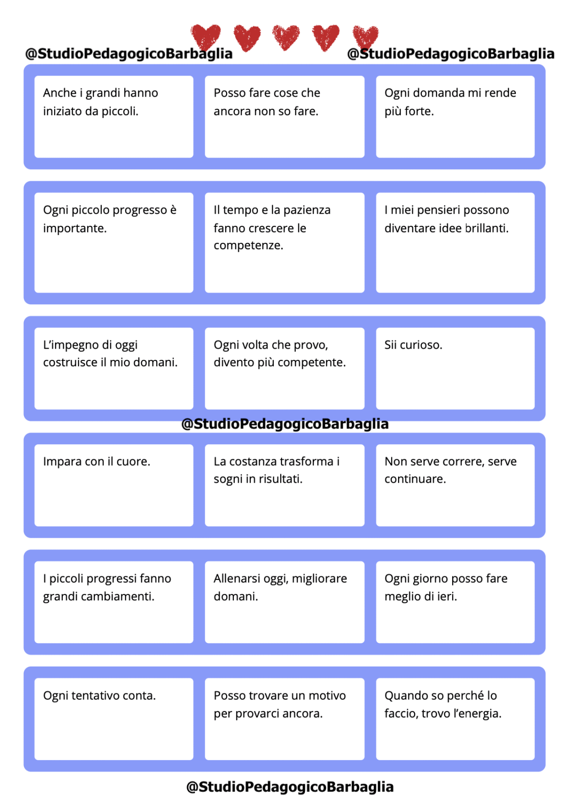 Una raccolta di frasi educative pensate per sostenere bambini e ragazzi nel loro percorso di apprendimento e crescita personale. Ogni frase è breve, chiara e positiva, costruita per rafforzare l’impegno costante, la motivazione, l’autostima e la capacità di superare le difficoltà. I contenuti si ispirano ai principi della pedagogia della modificabilità cognitiva (Reuven Feuerstein) e alla mentalità di crescita: l’intelligenza non è fissa, le competenze si sviluppano, ogni bambino può migliorare.