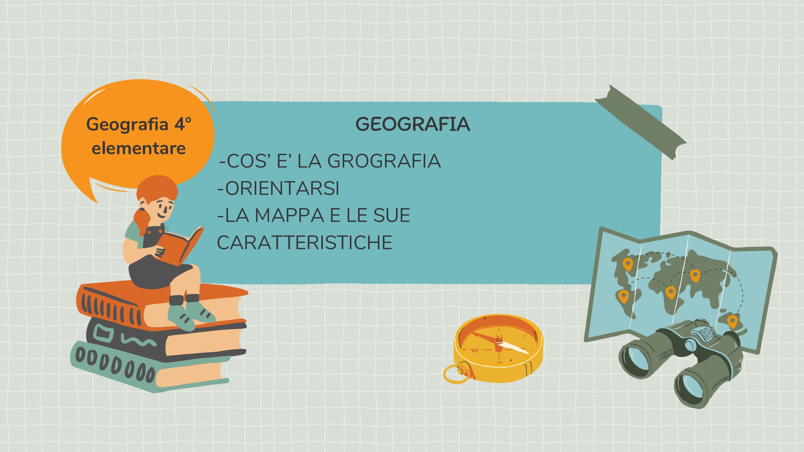 Schema sulla definizione di geografia, sull’orientamento e sulla mappa e le sue caratteristiche.