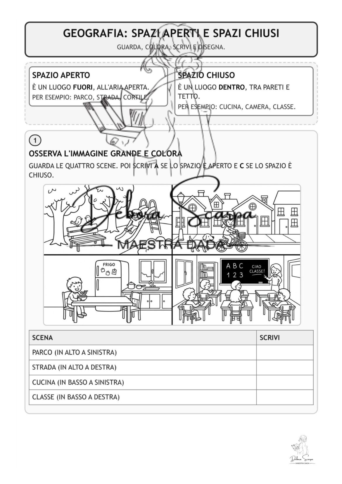 Schede didattiche di geografia per la classe prima elementare sulla differenza tra spazi aperti e spazi chiusi