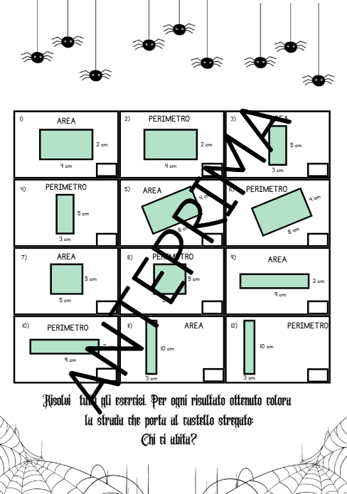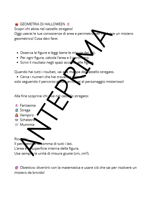 Un’avventura geometrica tra fantasmi e castelli stregati! Rendi lo studio di area e perimetro davvero… magico! In questa scheda a tema Halloween, i bambini dovranno risolvere esercizi di geometria per scoprire chi abita nel castello stregato. ✅ Cosa troverai nella scheda: esercizi su area e perimetro con figure geometriche semplici; attività ludica finale con mappa da colorare in base ai risultati; grafica in bianco e nero, perfetta per la stampa; pensata per classe quinta primaria, ma adatta anche per il ripasso in quarta. 🎯 Obiettivi didattici: Consolidare il calcolo di area e perimetro; Stimolare la logica e la concentrazione attraverso il gioco. 🧩 Ideale per: attività di rinforzo e verifica; compiti a casa o stazione di apprendimento a tema Halloween Come funziona: Osserva le figure geometriche e leggi bene le misure indicate sui lati. Per ogni figura, calcola l’area e il perimetro. Scrivi il risultato accanto alla figura, nello spazio previsto. Ricorda: usa le formule corrette per rettangoli e quadrati! Una volta trovati tutti i risultati, cerca i numeri corrispondenti nella mappa del castello stregato. Colora il percorso seguendo solo le caselle che contengono i tuoi risultati. La strada giusta ti porterà fino al castello… Alla fine, scoprirai chi abita nel castello stregato: 👻 Fantasma, 🧛♂️ Vampiro, 🧙♀️ Strega, 💀 Scheletro o 🧻 Mummia? 🎃 Solo risolvendo correttamente tutti i calcoli, il percorso sarà completo e svelerà il misterioso abitante del castello!