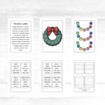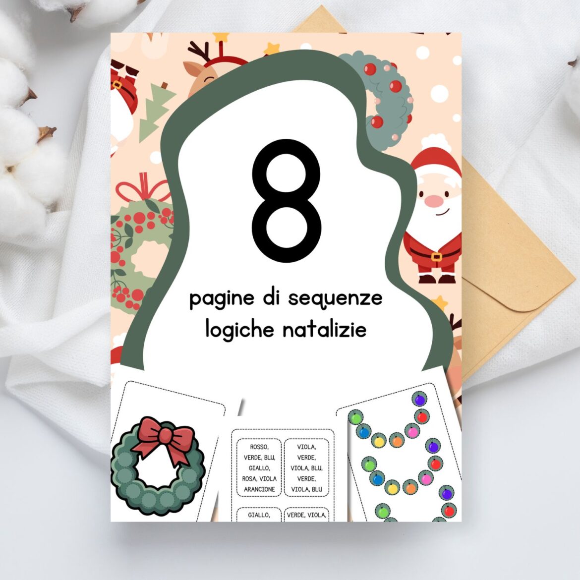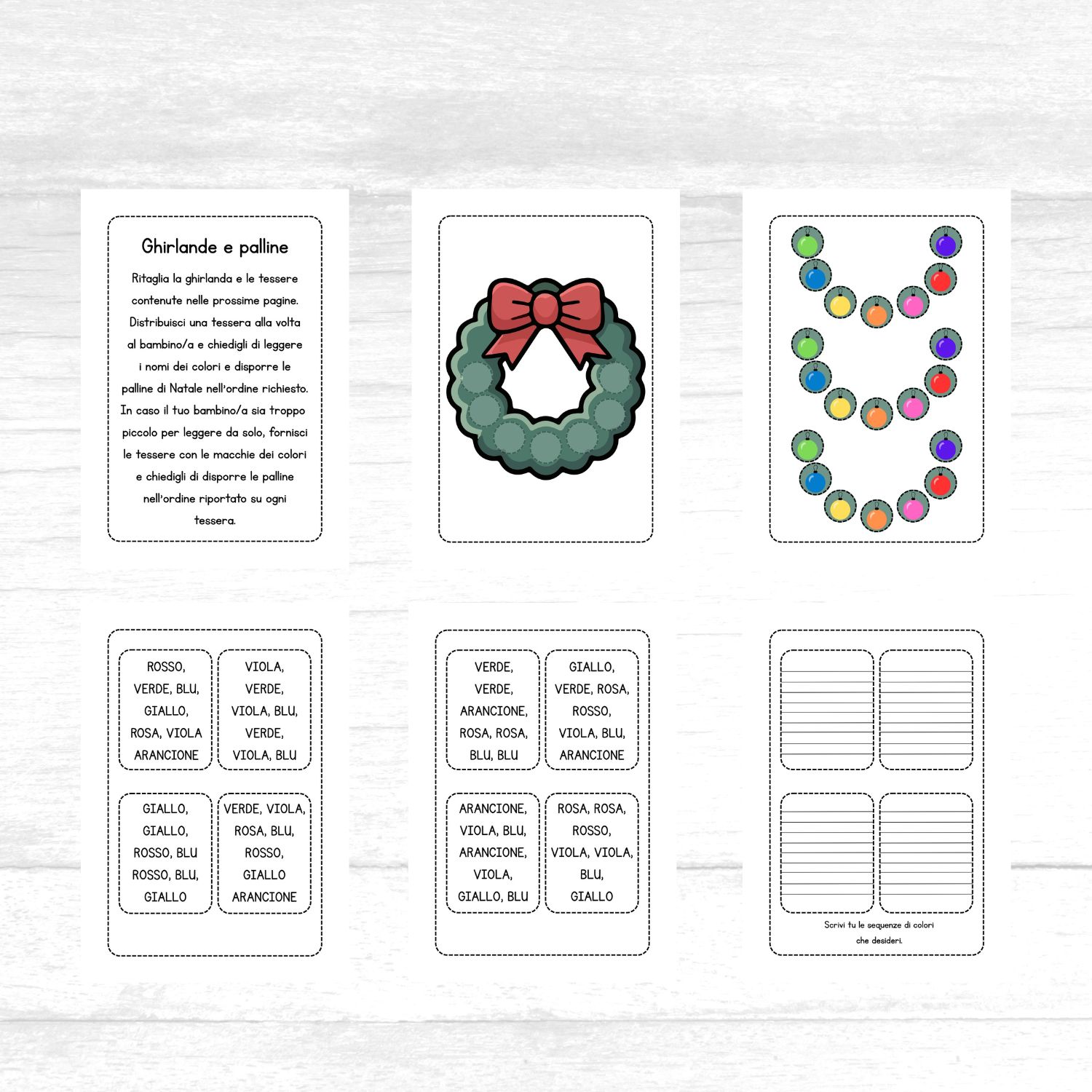 Il PDF include la ghirlanda natalizia e le palline colorate. Inoltre include delle carte da stampare e ritagliare, con le varie sequenze logiche da far seguire al bambino per mettere di volta in volta, in ordine le varie palline colorate sulla ghirlanda.
