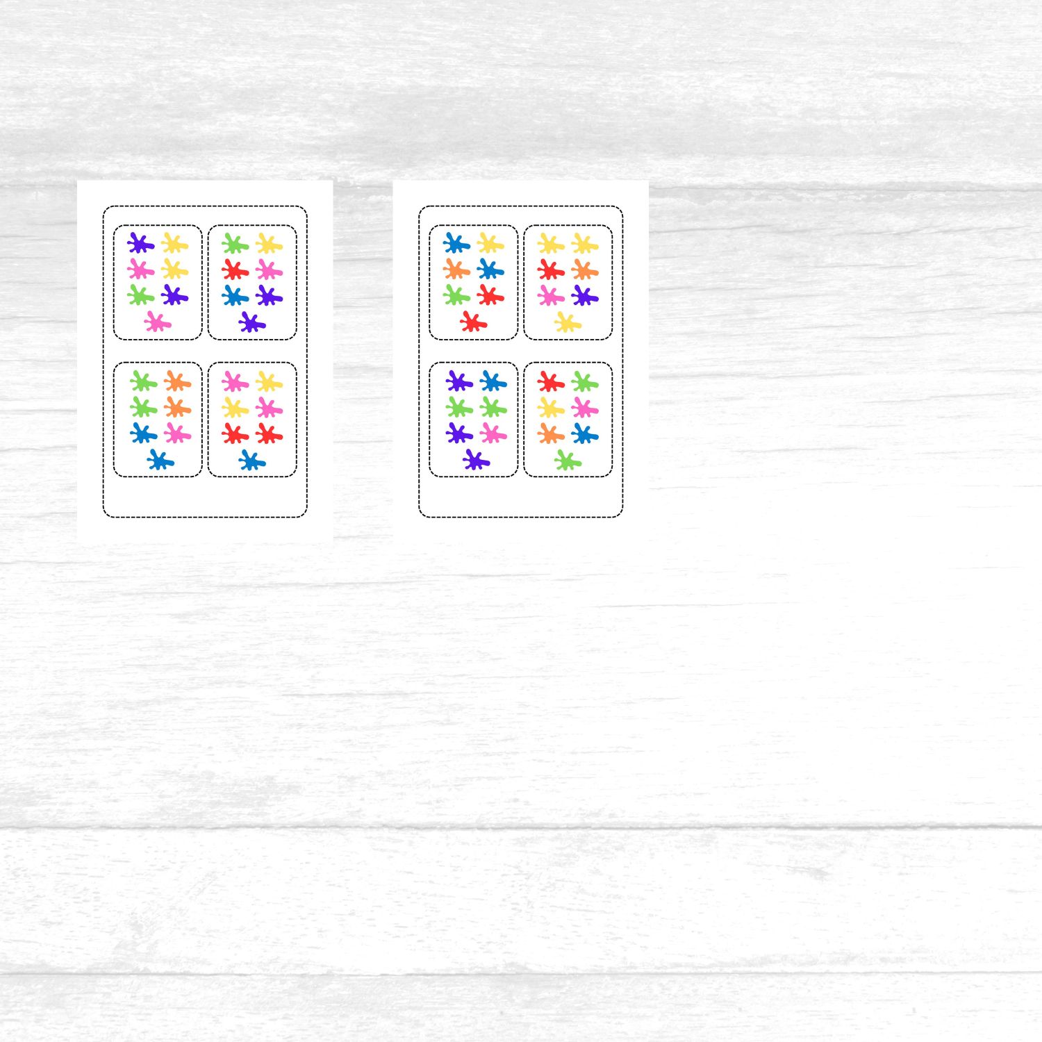 Le carte sono presenti sia con i nomi dei colori scritti in stampatello maiuscolo, sia con alcune macchie di colore corrispondenti ai colori delle palline da disporre. In questo modo il gioco diventa adatto a più età.