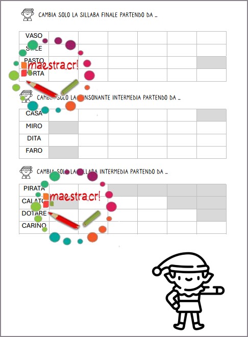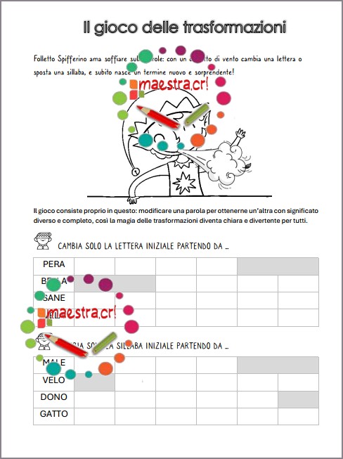 • Giochi di trasformazione: modifica lettere e sillabe (iniziali, finali o centrali) per dare vita a nuove parole.