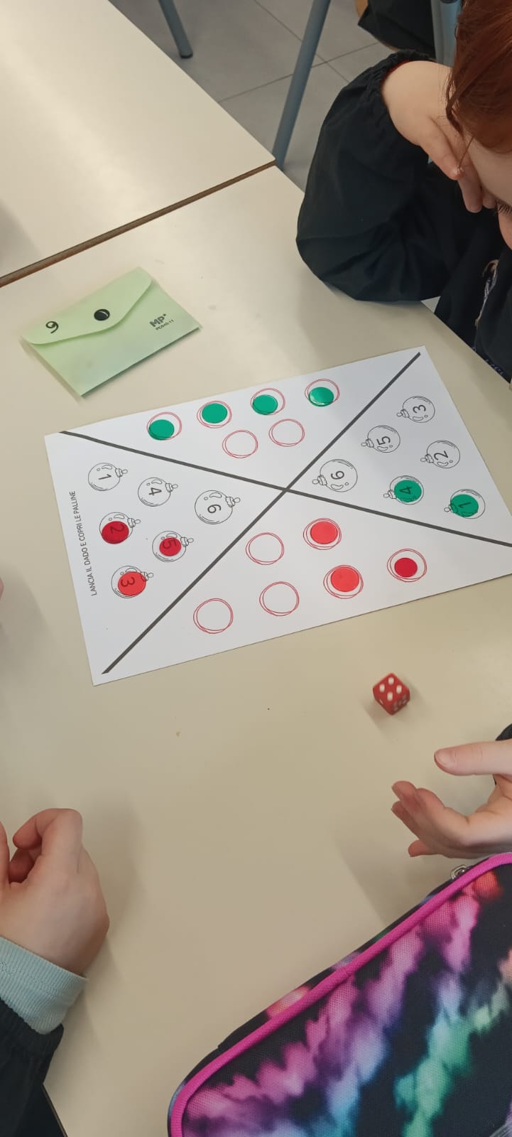 Ho trovato questo gioco sul web e non ho resistito! Ho dovuto prepararlo per i miei bimbi di prima. Si lancia il dado e il bambino che ha ottenuto il numero mette un suo gettone sul numero corrispondente. Se ottengo un numero che ho già coperto passo il turno. Vince chi riempie prima tutte le sue palline.