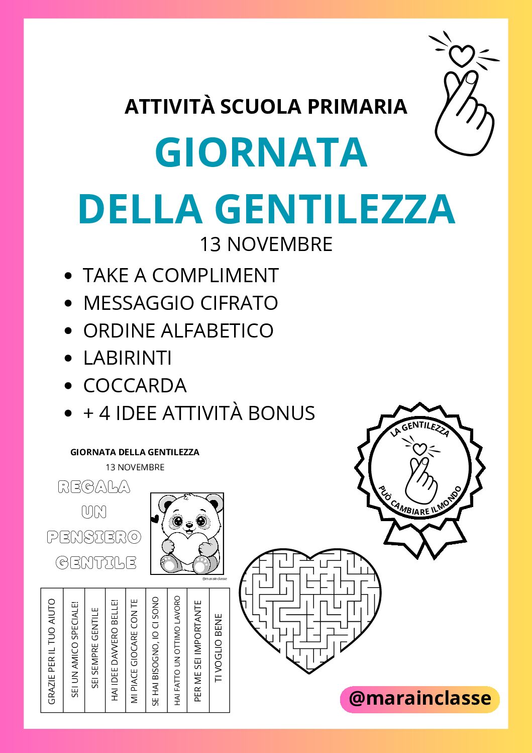 Attività per la giornata della gentilezza – scuola primaria: take a compliment – labirinti – messaggio cifrato con operazioni – ordine alfabetico – coccarda per fine giornata – 4 idee di attività bonus da proporre prima o dopo la giornata della gentilezza, ma anche in qualunque momento dell’anno.