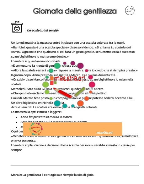 ✨ Celebra la Giornata della Gentilezza e promuovi l’Educazione Civica in modo dinamico e coinvolgente con questo ricco kit di attività pensato per la tua classe. I contenuti proposti guidano bambine e bambini alla scoperta del valore della gentilezza, aiutandoli a riconoscere comportamenti positivi e a sviluppare empatia attraverso esperienze ludiche e stimolanti.