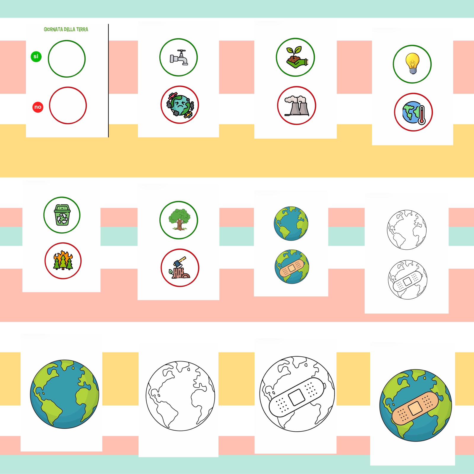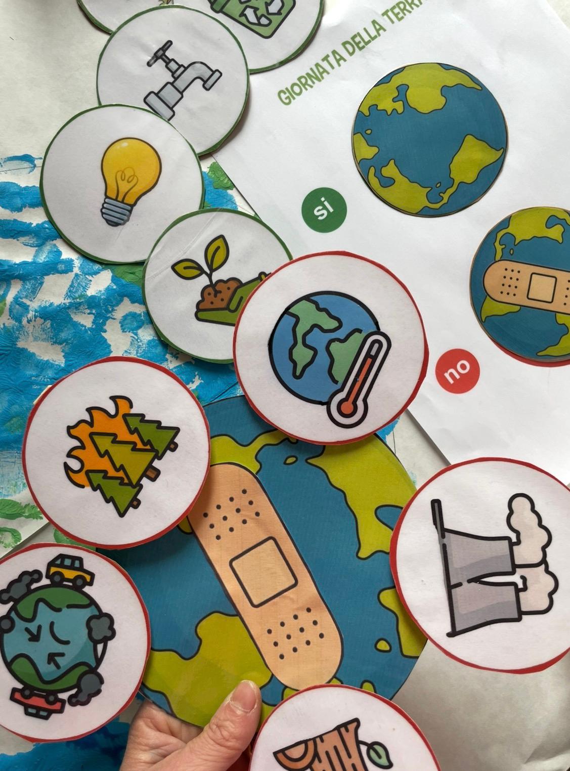 Stampiamo ora la grande Terra colorata, (o coloriamola) e proviamo ad attaccare (gioco), i comportamenti sì e quelli no. ( Video @unamammainbiblioteca)