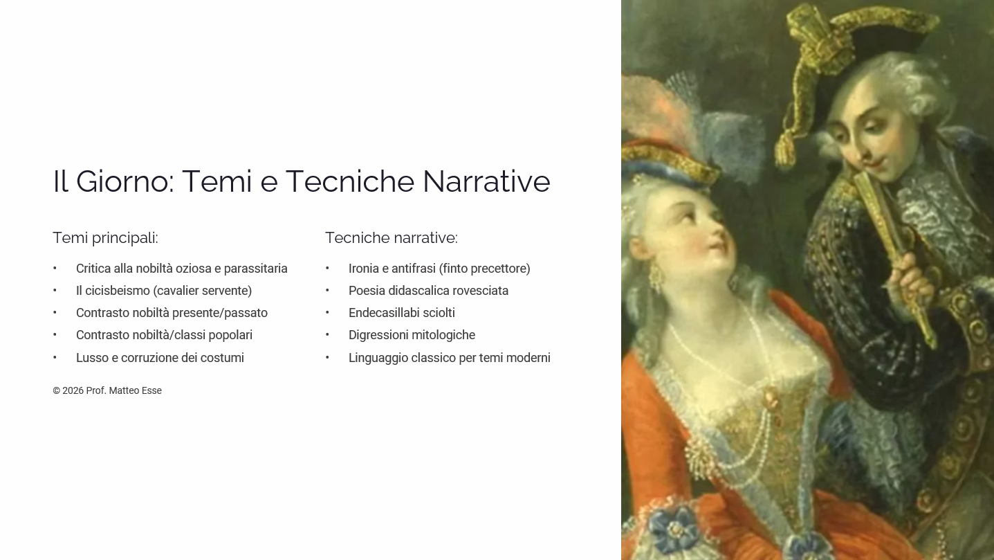 Contenuti Chiave: Focus sull’ironia, l’antifrasi, il “cicisbeismo” e il passaggio verso il Neoclassicismo.