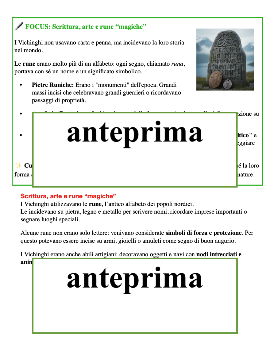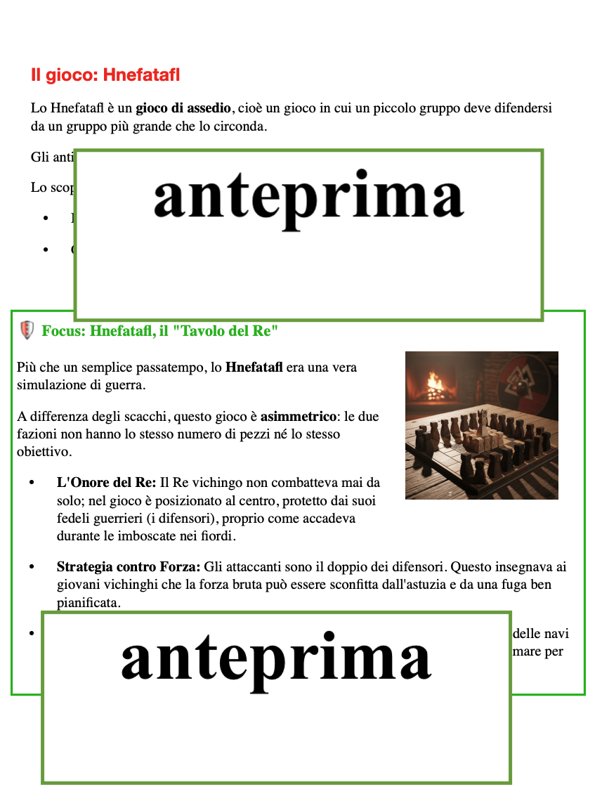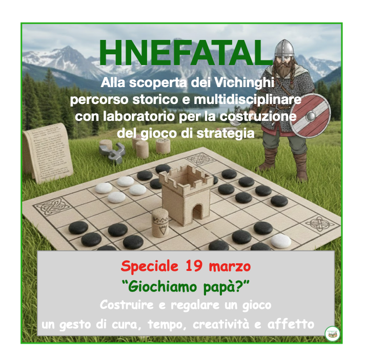Hnefatafl – Alla Scoperta dei Vichinghi Speciale 19 marzo: “Giochiamo, Papà?” Un percorso creativo e storico per costruire insieme un gioco vichingo, da regalare e condividere in famiglia! Età consigliata: 6-11 anni Ambiti educativi: storia, arte, tecnologia, logica, strategia, STEM, creatività Introduzione La festa del papà diventa un’occasione per imparare giocando e creando: con Hnefatafl, i bambini scoprono il mondo dei Vichinghi e si cimentano in un gioco di strategia antichissimo, costruendo con le proprie mani il tabellone, le pedine e un castello 3D. Non è solo un’attività per il 19 marzo: questo materiale può essere utilizzato tutto l’anno per laboratori multidisciplinari, percorsi storici e attività STEM, stimolando curiosità, manualità e pensiero critico. Perché scegliere questo materiale Multidisciplinare: storia, arte, tecnologia/STEM, logica e strategia integrate in un unico percorso. Creativo e pratico: costruzione del tabellone, delle pedine e del castello 3D, con elementi grafici in stile vichingo da colorare e personalizzare. Educativo e divertente: stimola curiosità storica, riflessione, progettazione, manualità e capacità strategiche. Flessibile: può essere utilizzato in classe, in laboratorio, a casa o in piccoli gruppi; come percorso completo o attività modulare; con approccio guidato o libero. Attività di rielaborazione: numerose proposte per italiano, storia, arte e STEM per consolidare conoscenze e stimolare la creatività. Quiz finale e autovalutazione: domande a scelta multipla e tavola di controllo per verificare comprensione e apprendimento. Contenuti principali Storia e vita dei Vichinghi: dalle terre nordiche alla vita nei villaggi, le case lunghe, la famiglia, la tribù, abbigliamento, armi e strumenti, scrittura e rune “magiche”. Il gioco Hnefatafl: introduzione, regole, strategia e posizionamento delle pedine. Laboratorio creativo: griglie stampabili per il tabellone (grande o piccola), modelli grafici vichinghi, castello 3D da colorare, ritagliare e montare, personalizzazione di pedine e tabellone. Percorso multidisciplinare: attività integrate per italiano, storia, arte e STEM. Quiz finale: verifica con domande a scelta multipla e tavola di controllo per autovalutazione. Modalità di utilizzo Flessibile e modulabile: percorso completo o singole attività secondo le esigenze didattiche. In classe o in laboratorio: attività guidate o cooperative, stimolando discussioni, ricerche e laboratori creativi. A casa o in famiglia: momento condiviso tra bambini e genitori, ideale per la festa del papà. Didattica per stazioni o angoli tematici: ogni sezione può diventare una postazione autonoma di esplorazione e sperimentazione. Approccio guidato o libero: stimola autonomia, collaborazione e curiosità. Materiali inclusi nel pacchetto Griglie tabellone stampabili (grande e piccola) Modello di castello 3D da colorare, ritagliare e montare Schede pedine e suggerimenti di decorazione Schede quiz e tavola di controllo Box di approfondimento e focus visivi (immagini, simboli, rune) Numerose attività di rielaborazione per italiano, storia, arte e STEM