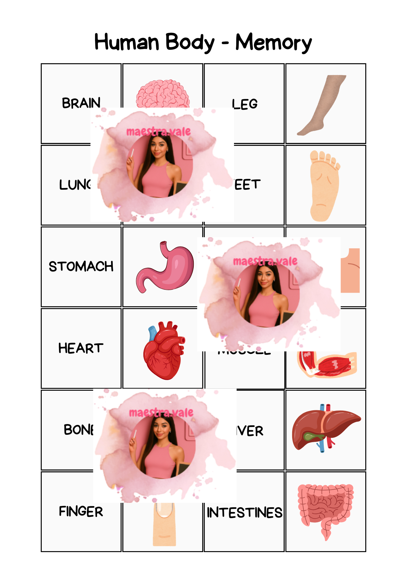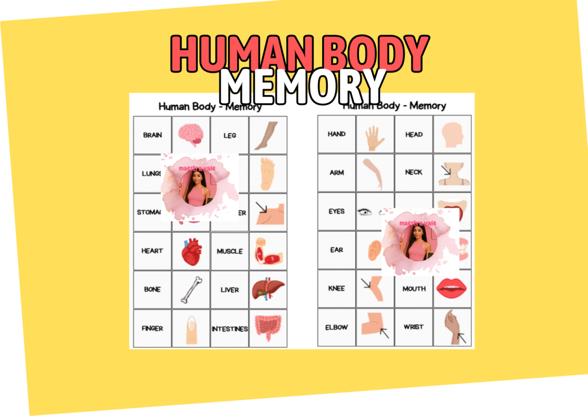 Questo memory sul corpo umano è un’attività educativa pensata per aiutare i bambini a imparare e ripassare il vocabolario delle parti del corpo in inglese attraverso il gioco.