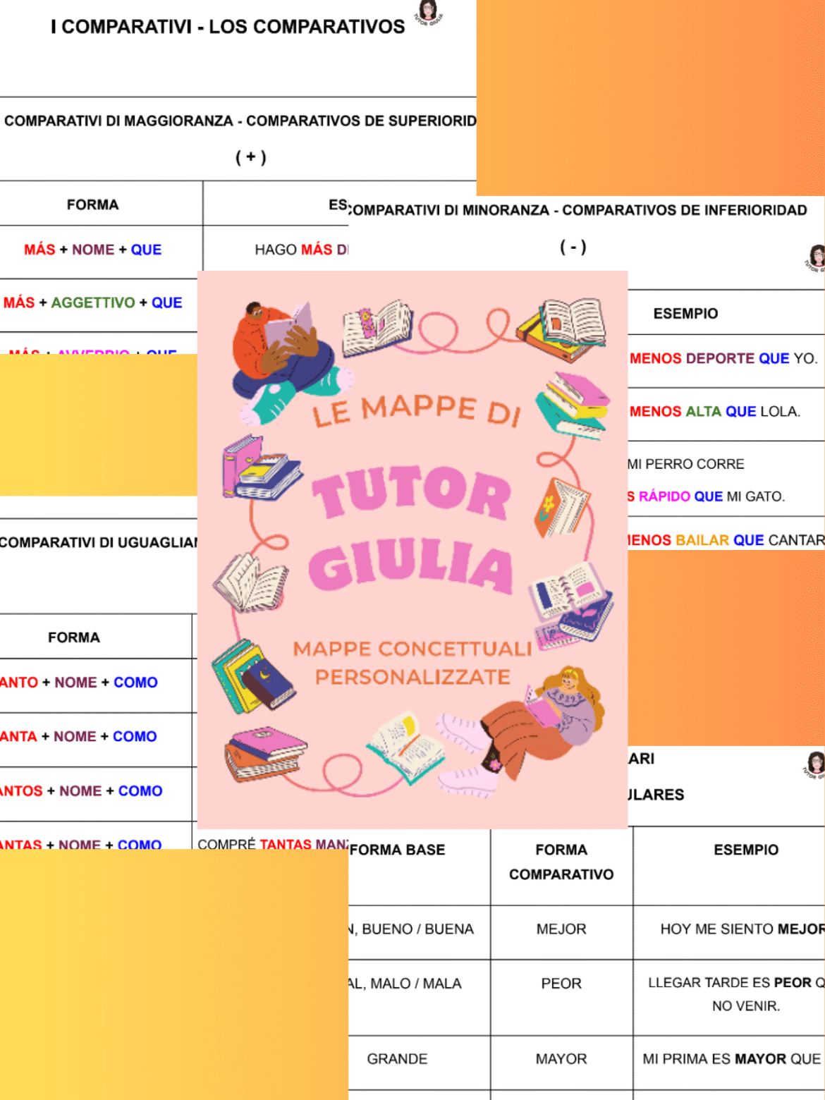 Schema/tabella sui comparativi (di maggioranza, di minoranza, di uguaglianza e irregolari) in Spagnolo, con spiegazioni della struttura grammaticale ed esempi semplici e pratici.