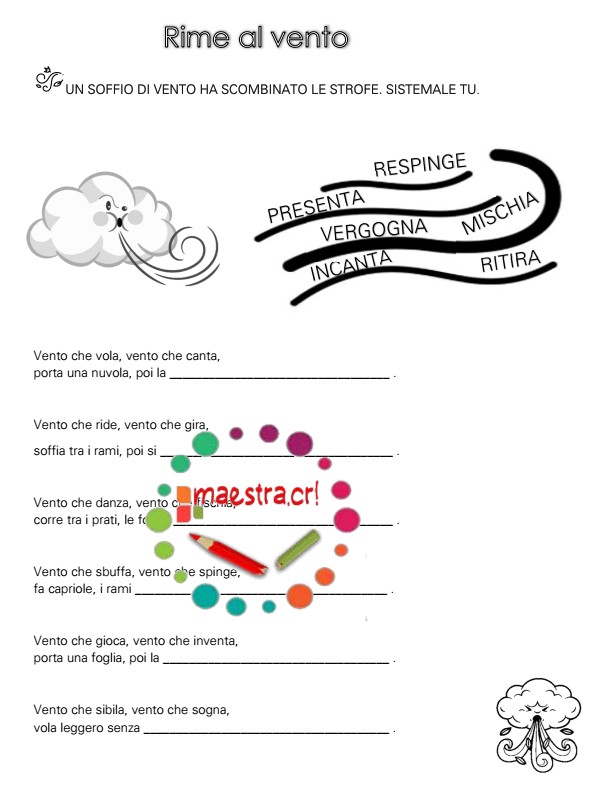 Un laboratorio dove i bambini ricostruiscono versi dispersi dal vento e completano poesie, allenando orecchio poetico e comprensione del testo.