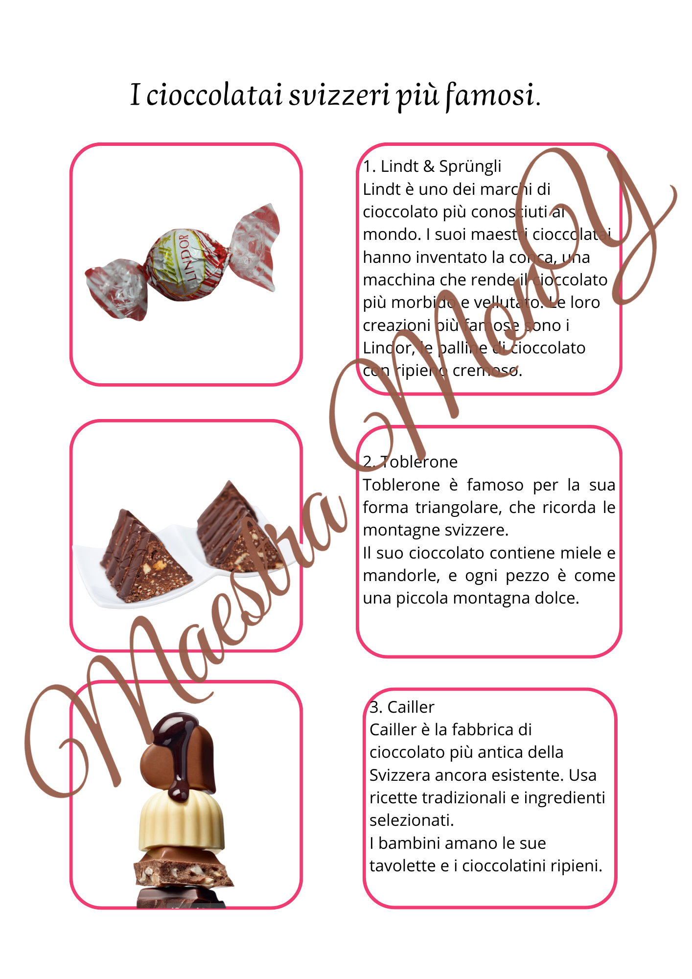- Schede informative sui più famosi cioccolatai svizzeri (come Lindt & Sprüngli, Toblerone, Cailler, Frey), con curiosità e descrizioni dei loro prodotti iconici.