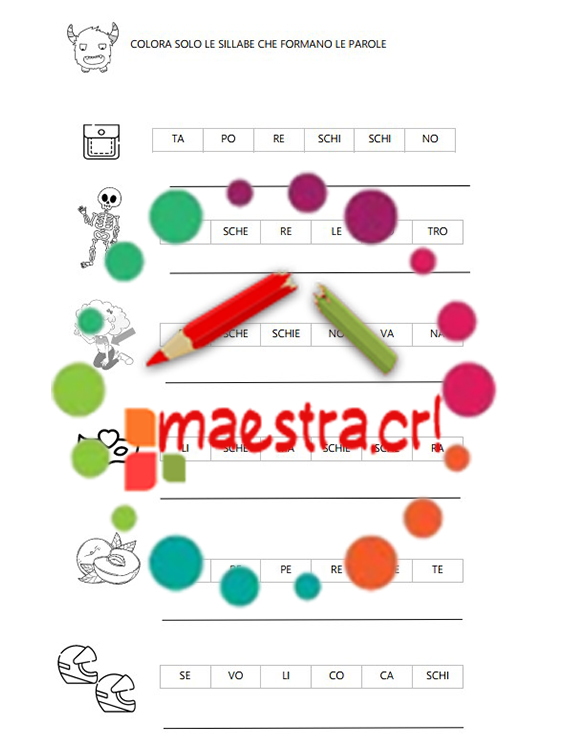 Esercizi graduati che favoriscono il riconoscimento e la corretta scrittura di queste sillabe.