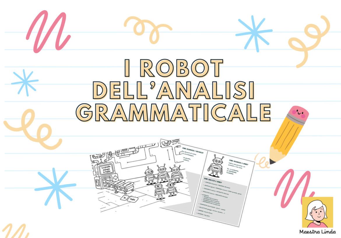 un libretto di istruzioni che i bambini devono ritagliare, colorare e personalizzare, per prendere confidenza con il materiale e fare proprio lo strumento compensativo. Il libretto guida il riconoscimento e l’analisi di articolo, nome, aggettivo e verbo attraverso spiegazioni semplici, esempi chiari e il supporto visivo dei “robot grammaticali”