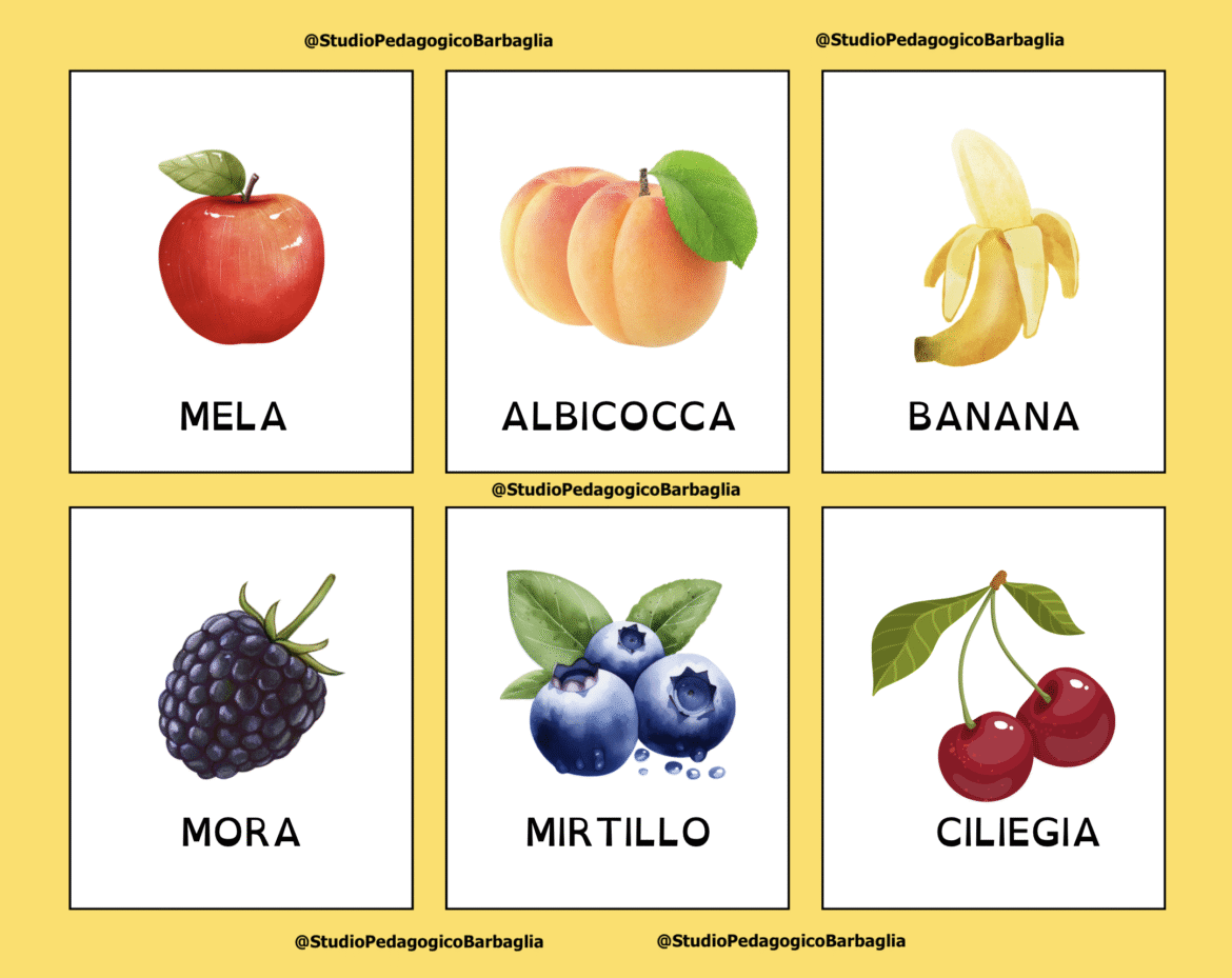 Le parole sono presentate in stampato maiuscolo, chiaro e facilmente leggibile, per favorire il riconoscimento visivo e supportare i primi apprendimenti di lettura e scrittura. Le schede permettono di conoscere e nominare diversi alimenti, stimolando la classificazione semantica (frutta, verdura, dolci, cibi salati, pasti) e la costruzione di concetti legati all’alimentazione.
