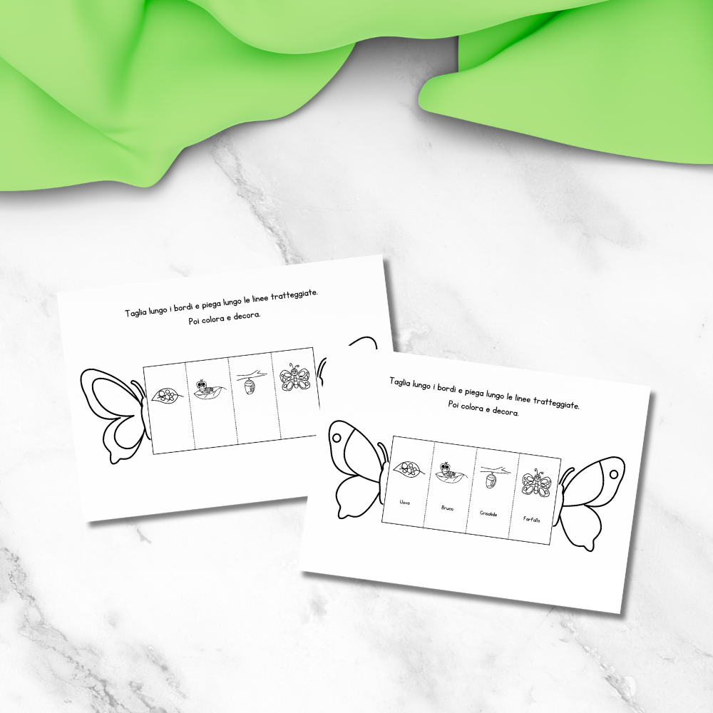 Questo PDF raccoglie 5 biglietti da tagliare e piegare per conoscere il ciclo di vita delle farfalle.