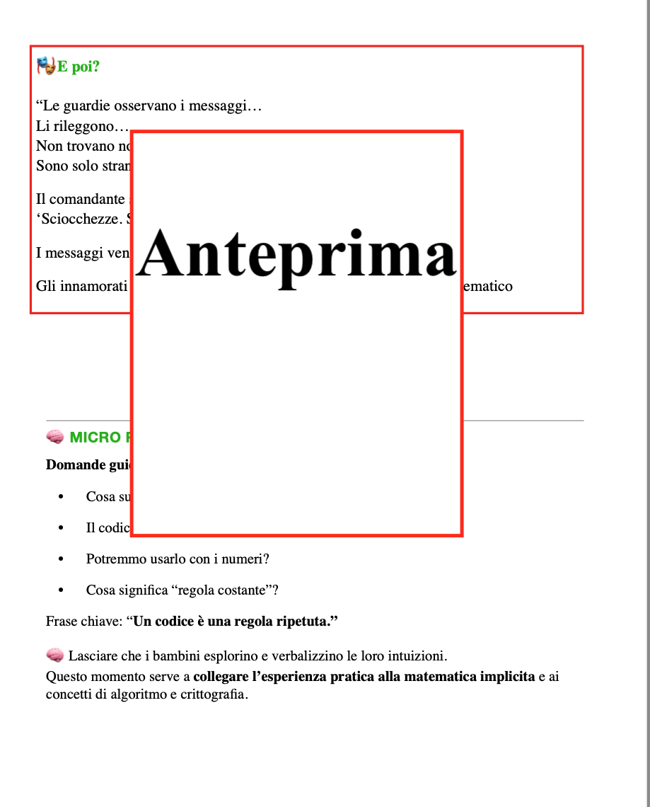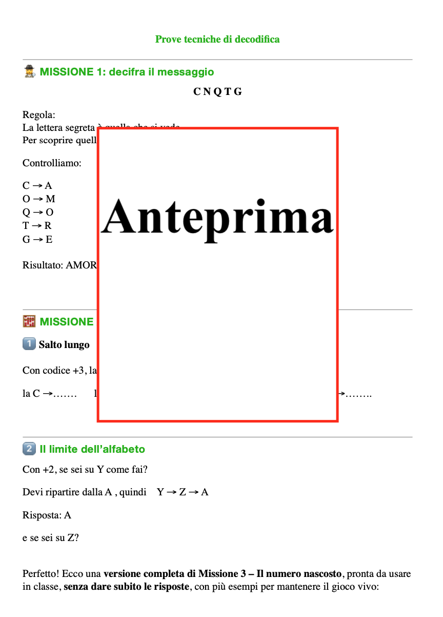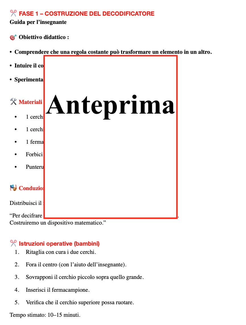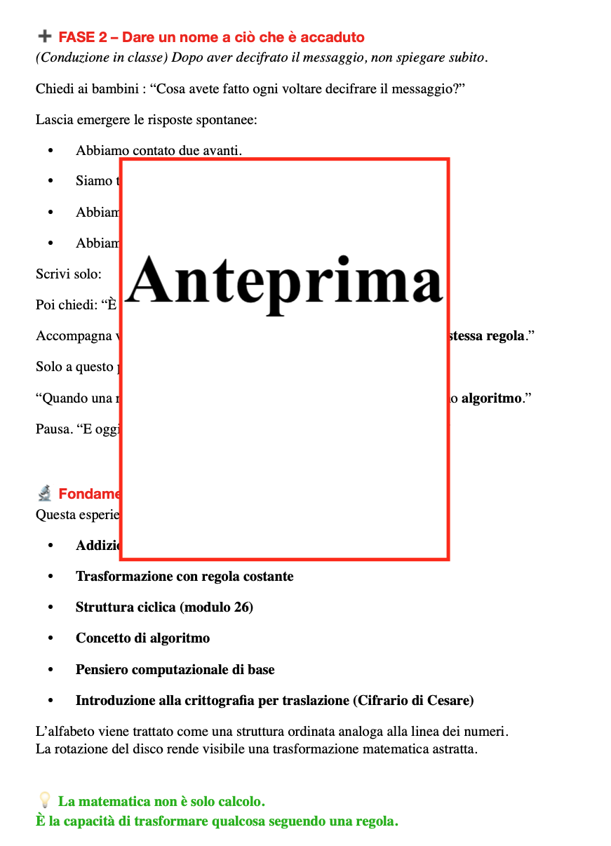 Il Cifrario di San Valentino Percorso STEM di matematica, crittografia e pensiero computazionale per la scuola primaria San Valentino non è solo cuori e regali. È anche una storia di messaggi nascosti, scelte coraggiose e comunicazione segreta. Questo percorso trasforma la ricorrenza in un’esperienza STEM autentica: un laboratorio narrativo in cui la matematica diventa strumento di logica, protezione e scoperta. Attraverso una missione immersiva, gli alunni costruiscono un vero decodificatore e sperimentano il funzionamento di un cifrario per traslazione. La regola matematica non viene spiegata subito: viene prima vissuta, manipolata, intuita. Solo successivamente viene resa esplicita e formalizzata. Il fascicolo include una guida di conduzione per l’insegnante con: indicazioni operative passo-passo suggerimenti di verbalizzazione domande guida per l’esplicitazione matematica note pedagogiche in chiave STEM suggerimenti per l’osservazione delle strategie degli alunni Non è una semplice attività tematica, ma un percorso strutturato e accompagnato. Modalità di lavoro L’attività può essere proposta: in piccolo gruppo cooperativo a coppie in modalità collettiva guidata con livelli differenziati di complessità È modulabile dalla classe seconda primaria e facilmente adattabile alle classi successive aumentando il numero dei salti o introducendo varianti di codice. Durata flessibile: 60–90 minuti, anche suddivisibili in due incontri. Struttura del percorso Il materiale è organizzato in fasi progressive: 1️⃣ Narrazione immersiva e attivazione teatrale 2️⃣ Costruzione del decodificatore (laboratorio STEM manipolativo) 3️⃣ Missioni di decodifica con tavola di controllo 4️⃣ Esplicitazione matematica e formalizzazione dell’algoritmo 5️⃣ Creazione autonoma del proprio cifrario Fase avanzata – Progettare un codice Nella versione più avanzata, gli alunni non si limitano a scegliere il numero dei salti, ma progettano una nuova regola di trasformazione. Possono: differenziare vocali e consonanti alternare salti diversi introdurre simboli creare sistemi lettera-numero In questa fase diventano progettisti di algoritmi, consolidando il concetto di regola coerente e ripetibile. Cosa apprendono realmente gli alunni Attraverso il gioco di decodifica sperimentano: addizione e sottrazione costante struttura ciclica dell’alfabeto trasformazione su sistema ordinato concetto di algoritmo basi della crittografia pensiero computazionale problem solving cooperativo La matematica emerge dall’esperienza e diventa consapevolezza. Il fascicolo contiene ✔ Narrazione introduttiva pronta da leggere ✔ Cerchi alfabetici stampabili ✔ Schede missione operative ✔ Tavola di controllo per autocorrezione ✔ Sezione metacognitiva ✔ Guida docente per la conduzione e l’esplicitazione STEM materiale con guida passo passo per docente stampabile e pronto all’uso: 18 pagine