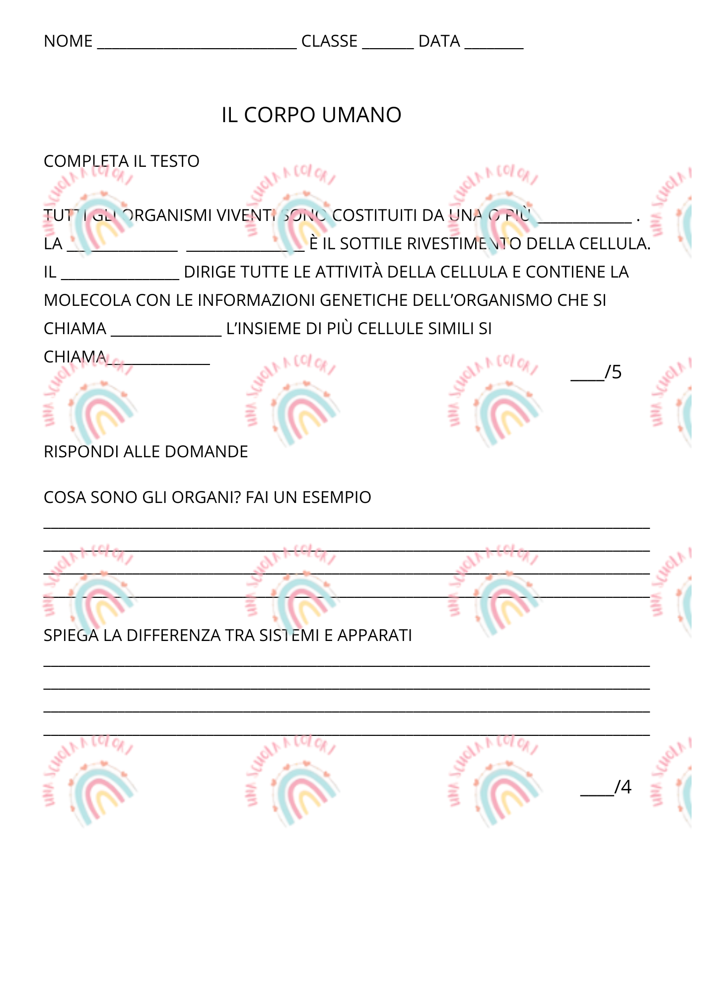 Prova di verifica sulle cellule i tessuti e il corpo umano con domande a risposta multipla, collegamneti e domande aperte