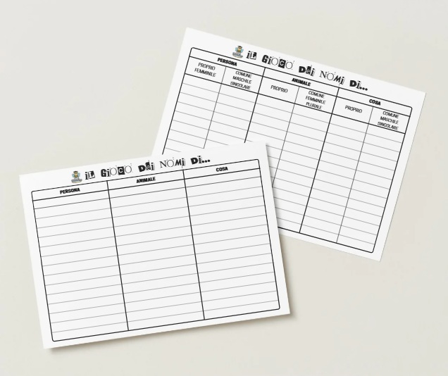 In stile “Nomi, cose e città”, il gioco dei nomi è stato pensato in 4 diverse versioni così da poter essere utilizzato in diverse fasi dell’apprendimento, ovvero “IL GIOCO DEI NOMI DI…”: