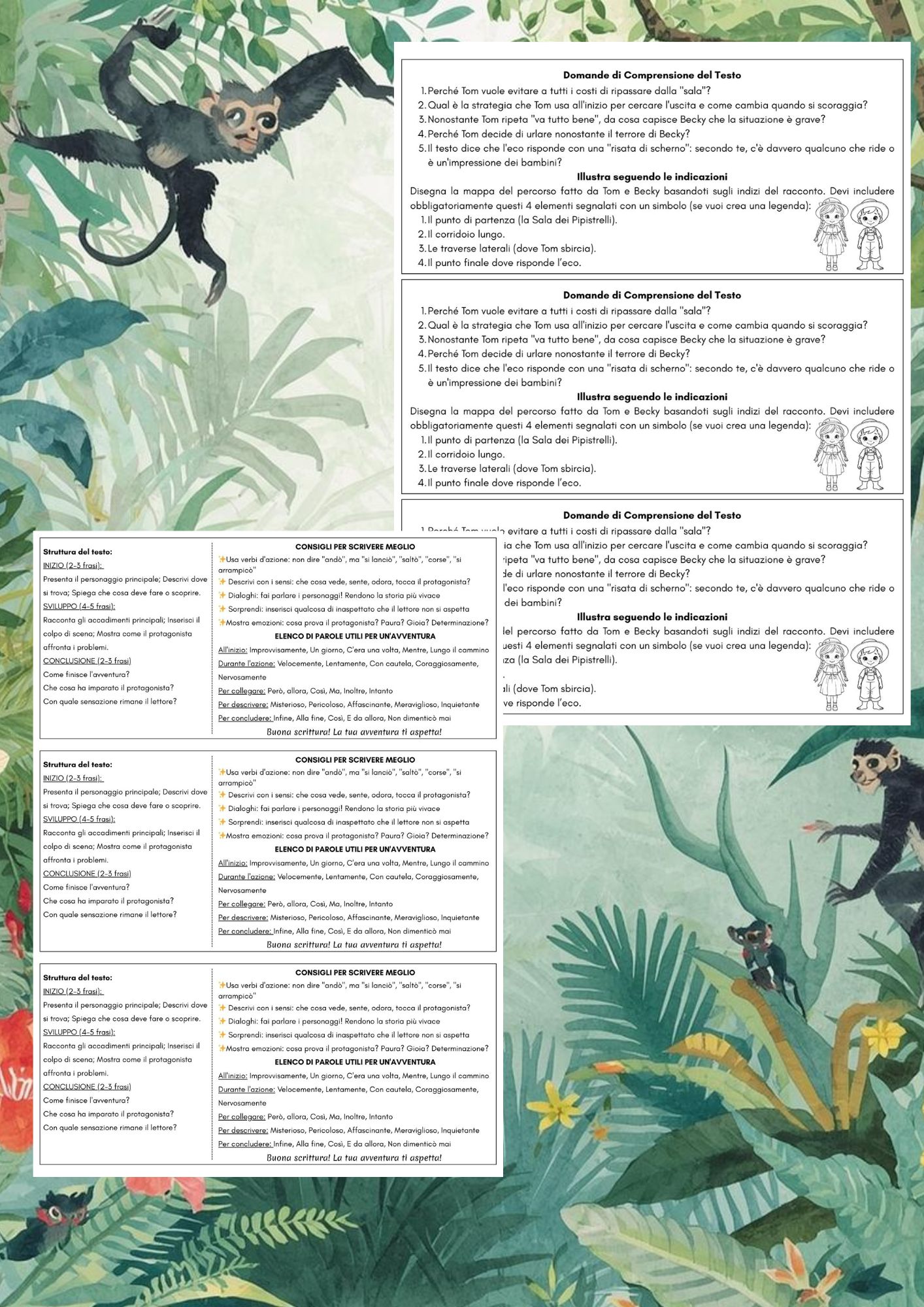 Racconto d’Avventura – Kit da realizzare sul quaderno Materiale didattico pronto all’uso per costruire sul quaderno una lezione completa sul racconto d’avventura ! Cosa acquisterai : 🛡️Un pdf di n. 6 pagine con immagini già pronte da stampare, ritagliare e incollare sul quaderno 🛡️Foto del quaderno di un’alunna come esempio di realizzazione completa, con la descrizione degli elementi del racconto d’avventura. 🛡️Schede “La Ricetta dell’Avventura” , trasformiamo la produzione scritta in un gioco di scelte. I bambini non devono inventare tutto da zero, ma possono “cucinare” la loro storia scegliendo tra diversi ingredienti narrativi già pronti: Il Menu dei Personaggi: Protagonisti, aiutanti e antagonisti; Le Ambientazioni: Luoghi misteriosi e affascinanti da esplorare; Spunti per l’inizio, missioni da compiere e colpi di scena; Lo Schema Guida per organizzare la scaletta; Consigli pratici e parole “amiche” per arricchire il testo. 🛡️Lettura di approfondimento, tratta da “Tom Sawyer” di Mark Twain, domande di comprensione e approfondimento, oltre a una consegna interdisciplinare con Arte e immagine, con le indicazioni per disegnare la mappa del percorso intrapreso nelle grotte da Tom e sua sorella Bechy. Come utilizzarlo: Stampa le immagini, fai ritagliare e incollare agli alunni seguendo l’esempio fotografato. Il risultato sarà un quaderno completo, ordinato e ricco di contenuti sul racconto d’avventura!