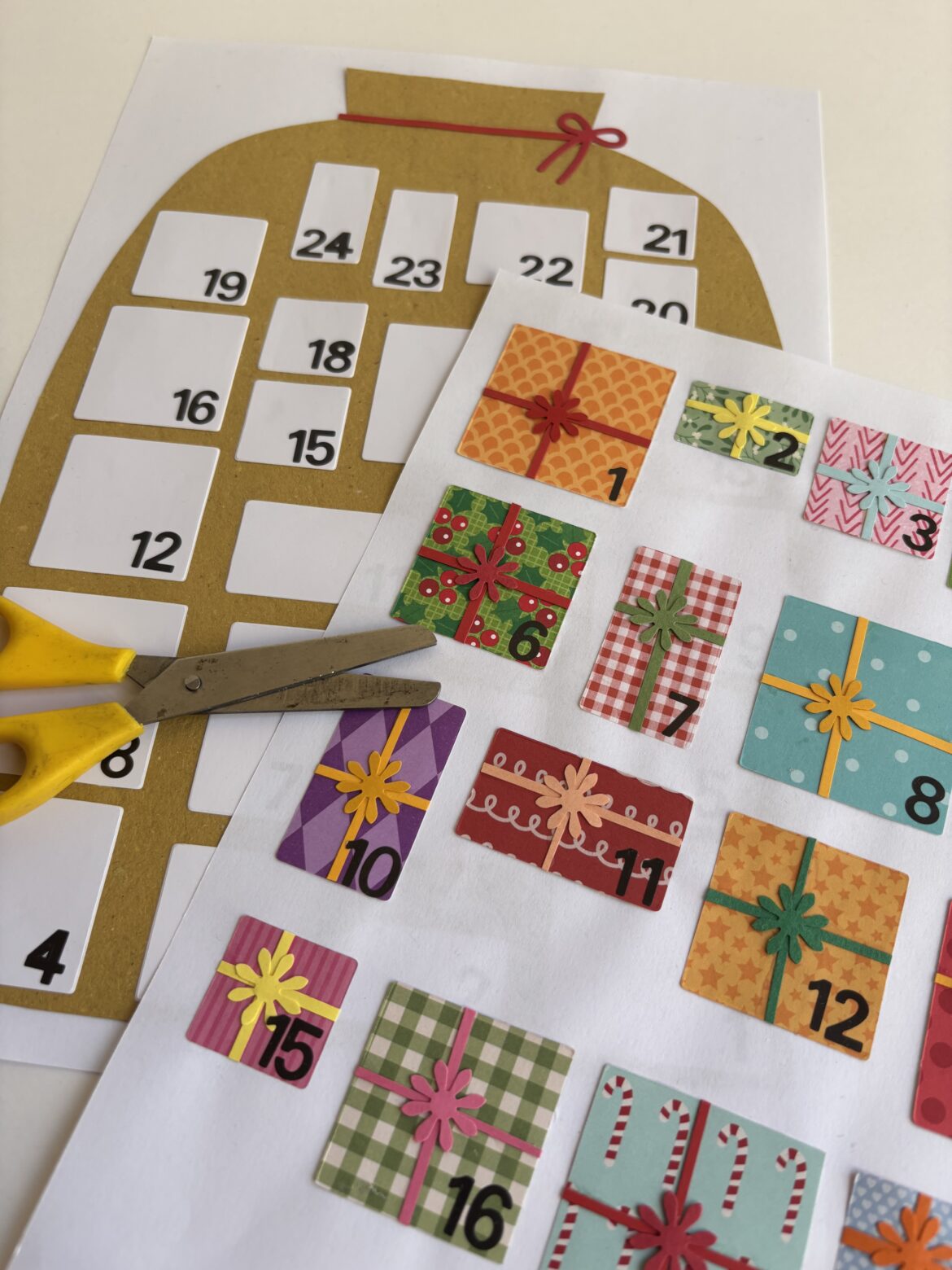 Un calendario dell’avvento, dove i bambini ogni giorno ritagliano un pacchetto, incollandolo dentro al sacco di Babbo Natale.