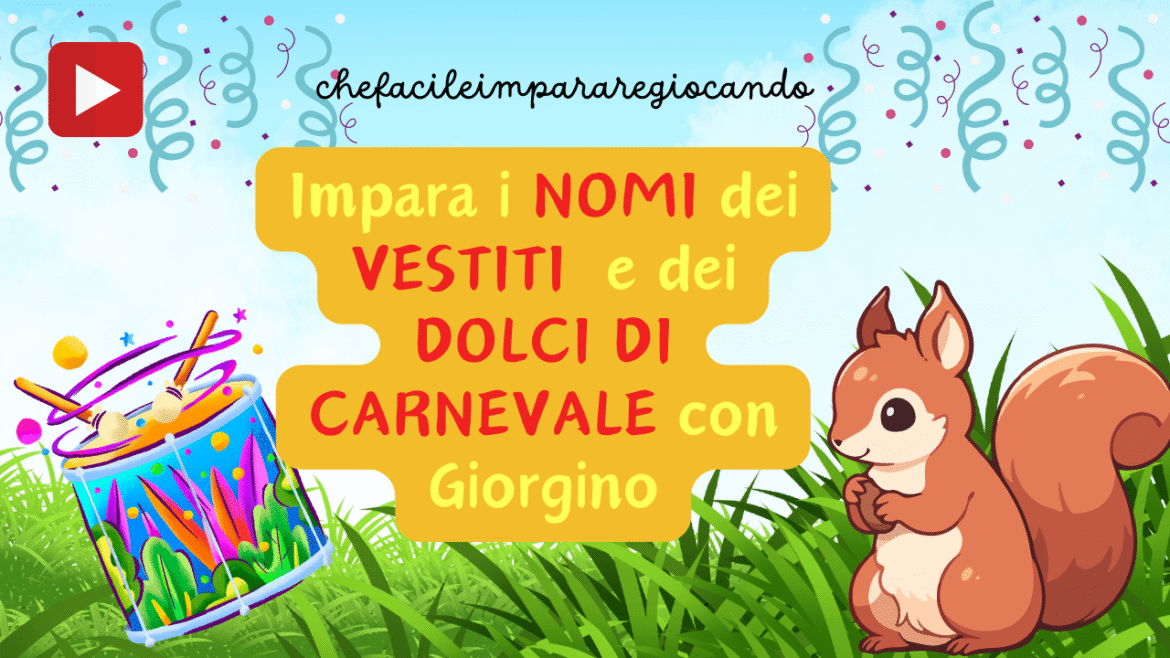 All’interno troverai una scheda con il QR code del video, dove Giorgino invita i bambini ad ascoltare e a ripetere i nomi dei dolci e dei costumi del Carnevale.