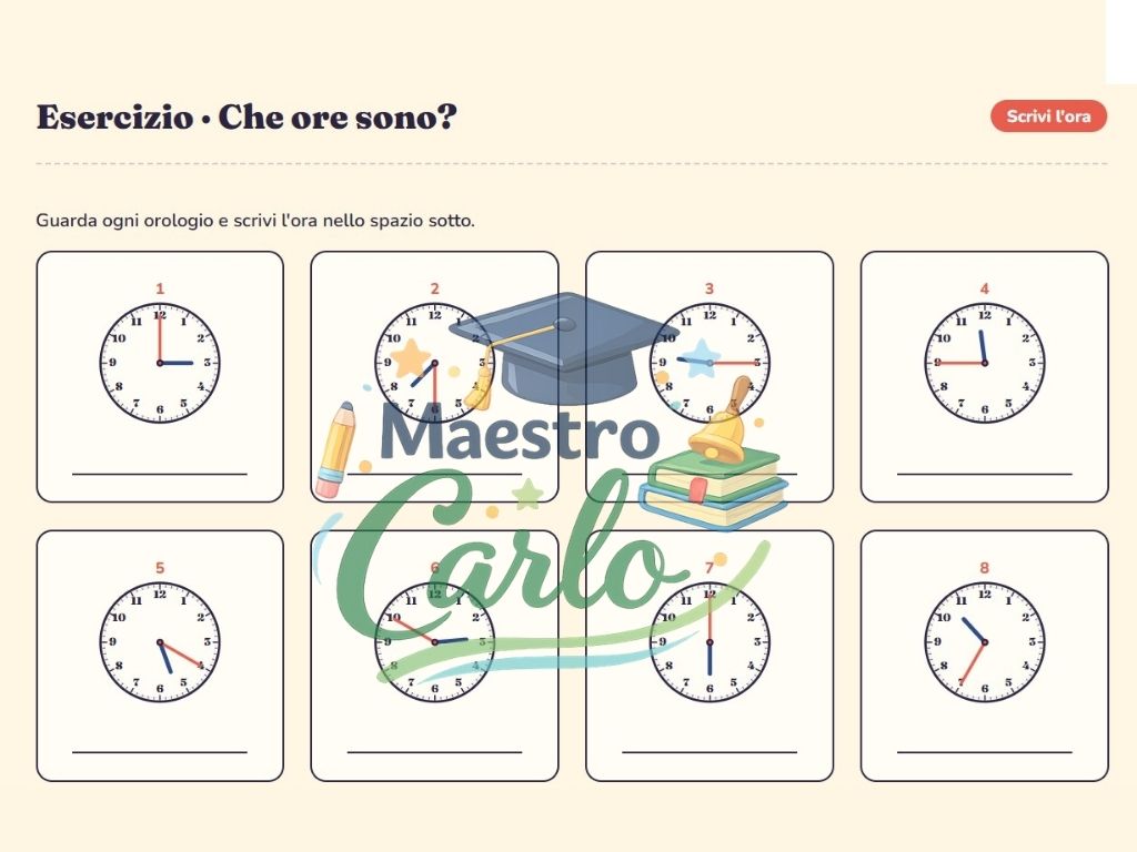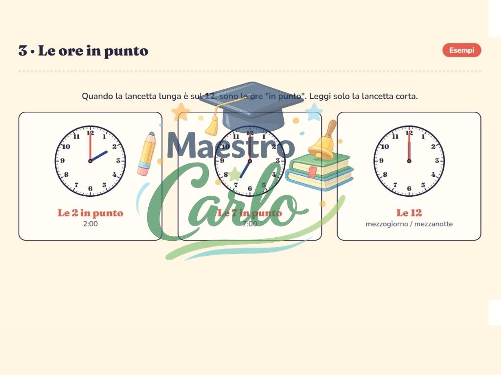 Il percorso parte dalle basi, come il quadrante e le due lancette, e prosegue con gli apprendimenti fondamentali: ore in punto, mezze ore, quarti d’ora, minuti precisi, fino ad arrivare anche a AM, PM e formato 24 ore. La struttura è progressiva e ben organizzata, ideale sia per l’introduzione dell’argomento sia per il ripasso.