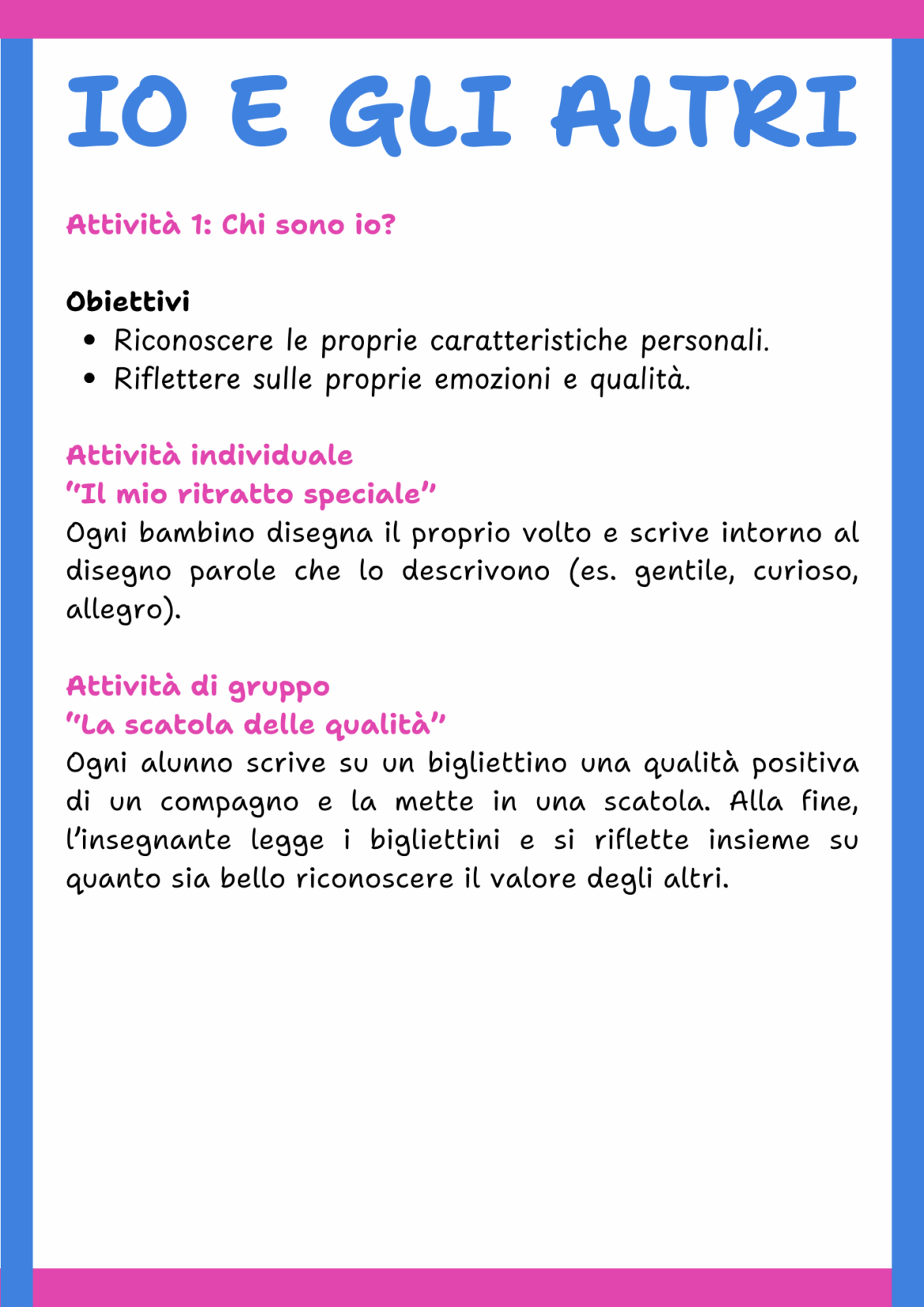 Trasforma la tua classe in una comunità consapevole e unita con questo progetto didattico completo. “Io e gli Altri” è un percorso strutturato per la scuola primaria, studiato per sviluppare appartenenza, empatia e responsabilità.