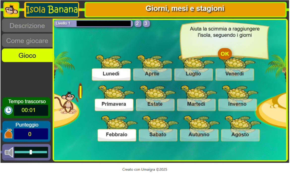 Il gioco didattico online. Bisogna aiutare la scimmietta a raggiungere l’isola delle banane, indicando le risposte giuste.