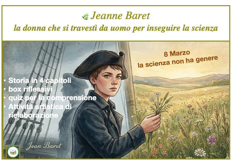 🌿 Jeanne Baret – La donna che si travestì da uomo per inseguire la scienza 8 Marzo – La scienza non ha genere Scopri la storia straordinaria di Jeanne Baret, la prima donna a circumnavigare il mondo, sfidando le regole del Settecento e superando barriere impensabili per inseguire la sua passione: la botanica. 🔹 Perché questo materiale è speciale Ispirazione e riflessione: racconta il coraggio e la curiosità di una donna che ha rotto i limiti imposti dal suo tempo. Approccio multidisciplinare: storia, scienze, geografia, educazione civica e arte in un unico percorso. Laboratorio creativo: dai quiz alle attività artistiche, dai box di riflessione alle “Foglie della Memoria e del Futuro”. Focus sulla parità di genere: stimola la discussione guidata sulle differenze, gli stereotipi e le possibilità di scelta di oggi. 🔹 Contenuti principali Storia in 4 capitoli con illustrazioni simboliche e box di riflessione. Epilogo riflessivo per collegare il passato al presente. Quiz a risposte chiuse con tavola di controllo per verificare la comprensione. Attività artistica e collaborativa: costruzione dell’albero delle Foglie della Memoria e del Futuro, per ricordare Jeanne e riflettere sul coraggio, la curiosità e le scelte libere. 🔹 Messaggio finale per bambini e bambine Jeanne Baret non voleva essere un’eroina, voleva solo studiare, osservare e esplorare. La sua storia ci ricorda che: La curiosità non ha genere. La competenza non ha volto. La passione non chiede permesso. Alle bambine: il mondo non è troppo grande per voi. Ai bambini: la forza non è occupare spazio, ma condividerlo. 💡 Ideale per insegnanti e laboratori Un percorso completo per celebrare l’8 Marzo, collegando storia, scienza e creatività, e per stimolare bambini e bambine a esplorare senza limiti ( classe 3-4-5- e secondaria di primo grado) Pronto da stampare, 16 pagine