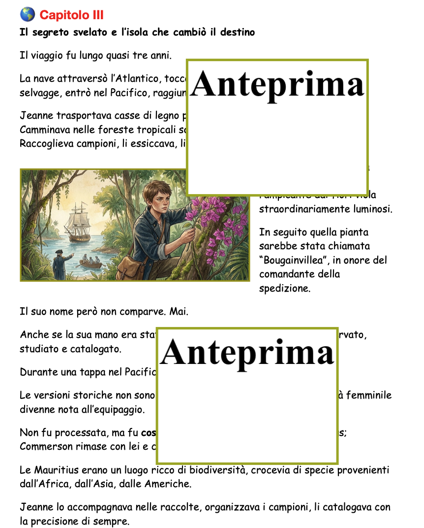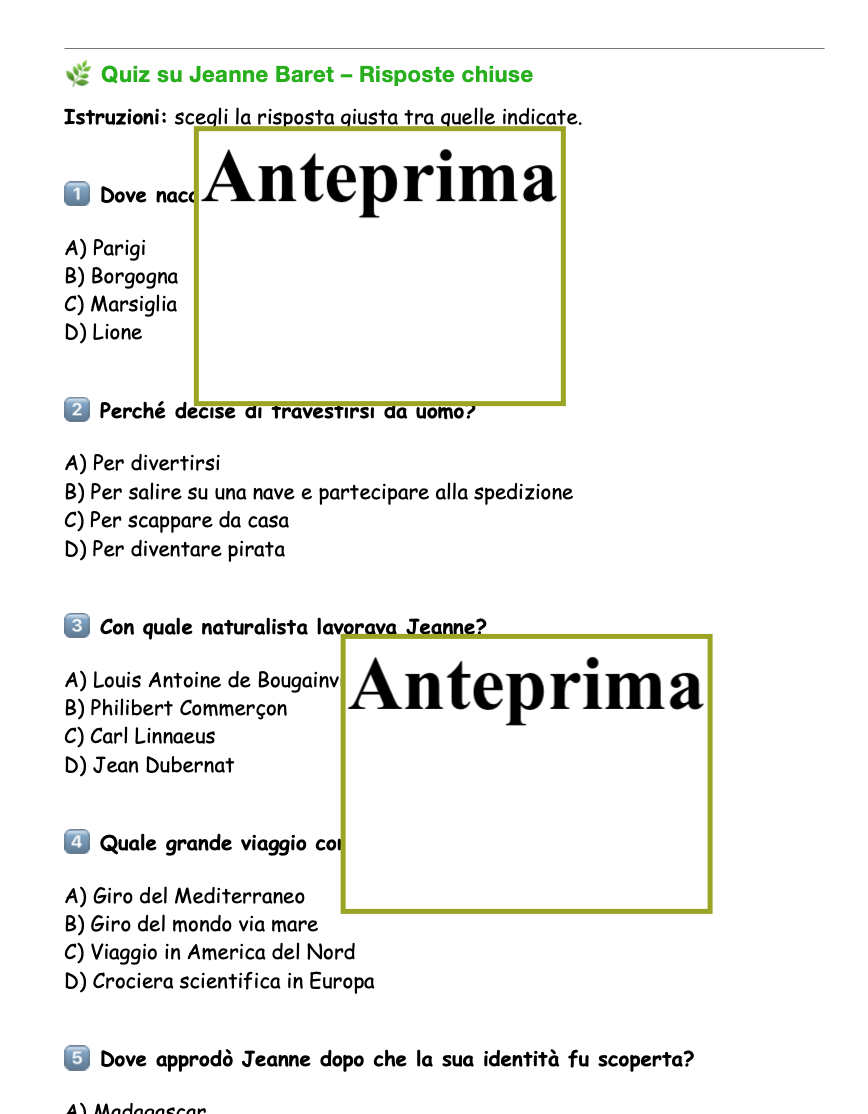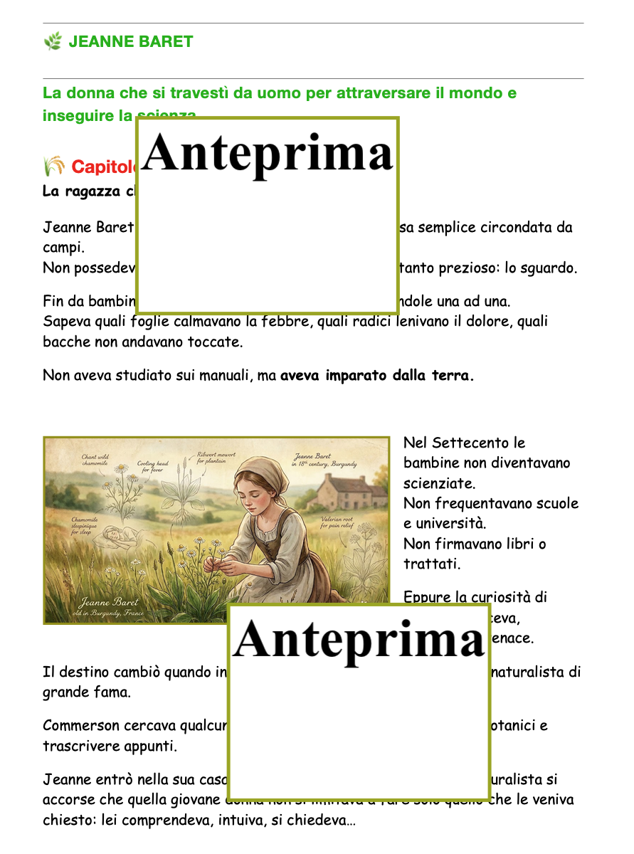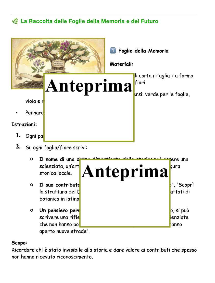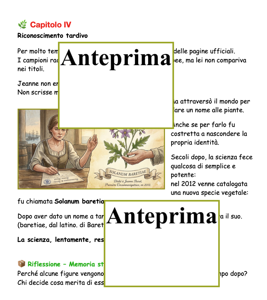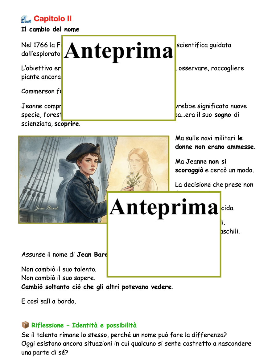 🌿 Jeanne Baret – La donna che si travestì da uomo per inseguire la scienza 8 Marzo – La scienza non ha genere Scopri la storia straordinaria di Jeanne Baret, la prima donna a circumnavigare il mondo, sfidando le regole del Settecento e superando barriere impensabili per inseguire la sua passione: la botanica. 🔹 Perché questo materiale è speciale Ispirazione e riflessione: racconta il coraggio e la curiosità di una donna che ha rotto i limiti imposti dal suo tempo. Approccio multidisciplinare: storia, scienze, geografia, educazione civica e arte in un unico percorso. Laboratorio creativo: dai quiz alle attività artistiche, dai box di riflessione alle “Foglie della Memoria e del Futuro”. Focus sulla parità di genere: stimola la discussione guidata sulle differenze, gli stereotipi e le possibilità di scelta di oggi. 🔹 Contenuti principali Storia in 4 capitoli con illustrazioni simboliche e box di riflessione. Epilogo riflessivo per collegare il passato al presente. Quiz a risposte chiuse con tavola di controllo per verificare la comprensione. Attività artistica e collaborativa: costruzione dell’albero delle Foglie della Memoria e del Futuro, per ricordare Jeanne e riflettere sul coraggio, la curiosità e le scelte libere. 🔹 Messaggio finale per bambini e bambine Jeanne Baret non voleva essere un’eroina, voleva solo studiare, osservare e esplorare. La sua storia ci ricorda che: La curiosità non ha genere. La competenza non ha volto. La passione non chiede permesso. Alle bambine: il mondo non è troppo grande per voi. Ai bambini: la forza non è occupare spazio, ma condividerlo. 💡 Ideale per insegnanti e laboratori Un percorso completo per celebrare l’8 Marzo, collegando storia, scienza e creatività, e per stimolare bambini e bambine a esplorare senza limiti ( classe 3-4-5- e secondaria di primo grado) Pronto da stampare, 16 pagine