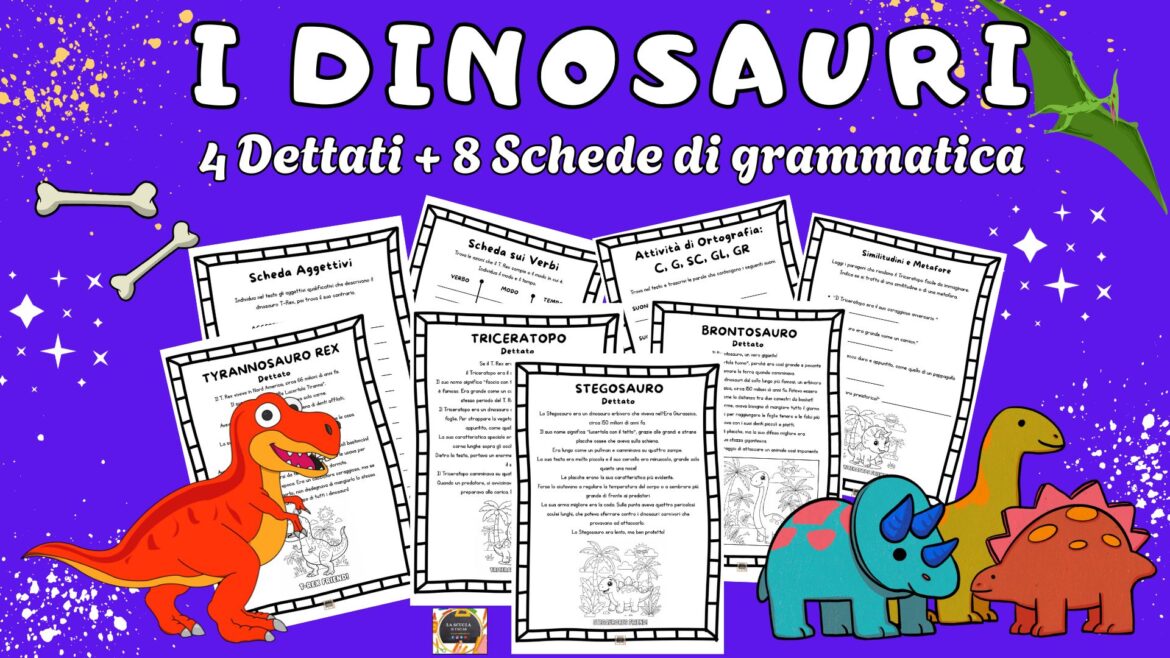 KIT I DINOSAURI: 4 dettati + 8 schede di grammatica Il pdf è pronto per essere stampato in A4.
