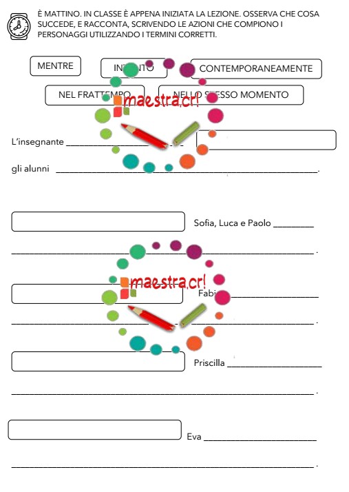 • Comprendere la simultaneità: riconoscere e descrivere azioni che avvengono nello stesso arco temporale.