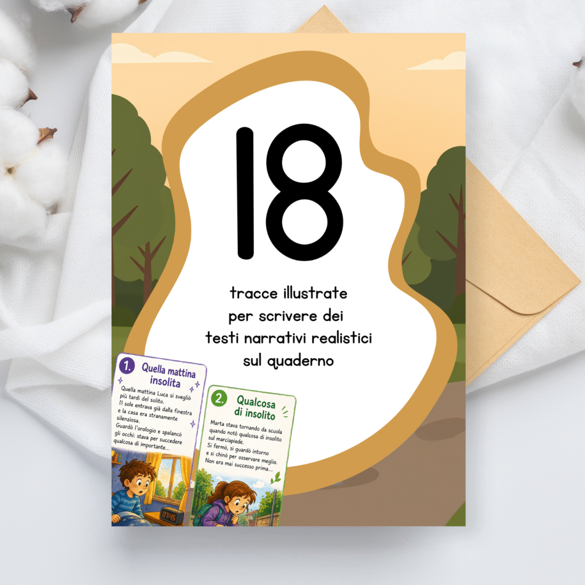Il PDF raccoglie 18 tracce illustrate di testi narrativi realistici da scrivere sul quaderno.