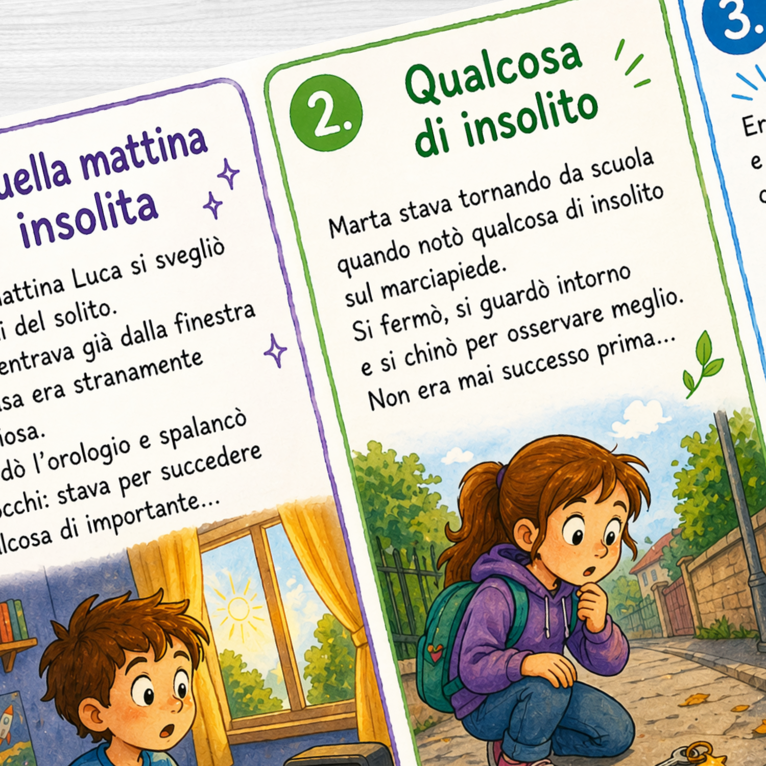 Ogni sezione propone un incipit già pronto, perfetto per superare il “blocco del foglio bianco”. Gli studenti possono scegliere la traccia che più li ispira e proseguire la narrazione seguendo il filo della loro fantasia.