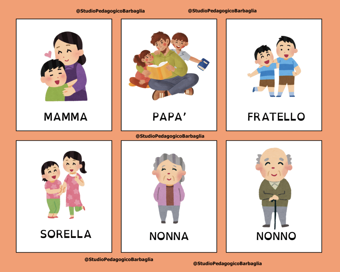 Questo set di schede lessicali sulla famiglia è pensato per accompagnare i bambini nella scoperta e nella denominazione delle principali figure familiari, favorendo lo sviluppo del linguaggio e l’arricchimento del vocabolario attraverso un tema profondamente legato alla loro esperienza personale ed emotiva.