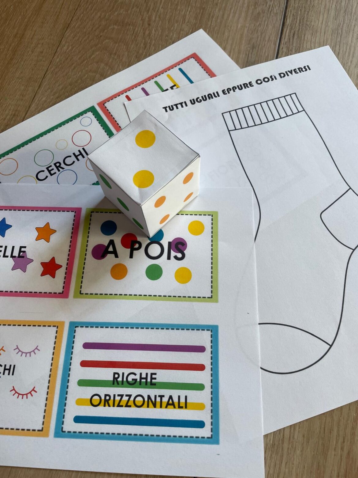 Dado + carte per giocare+ carte da rimepire e personalizzare+ calzino vuoto con frase+ biglietto della giornata dei calzini spaiati