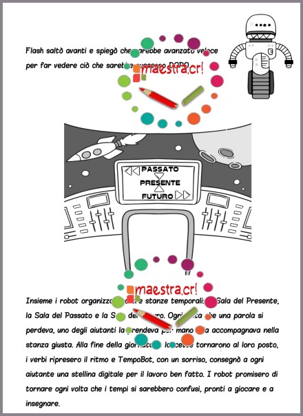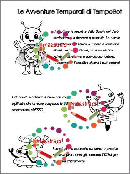 - Una storia originale che vede protagonisti TempoBot e i suoi fidati robot–Tick, Rewind e Flash–ognuno legato a un diverso tempo verbale, per rendere l’apprendimento più immediato e narrativo.