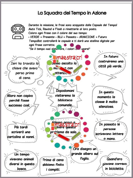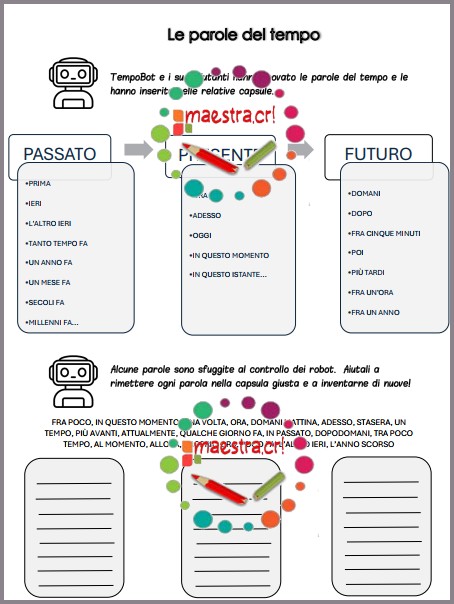 - Schede operative ricche di attività per riconoscere e utilizzare correttamente le “parole del tempo”, come avverbi ed espressioni temporali.