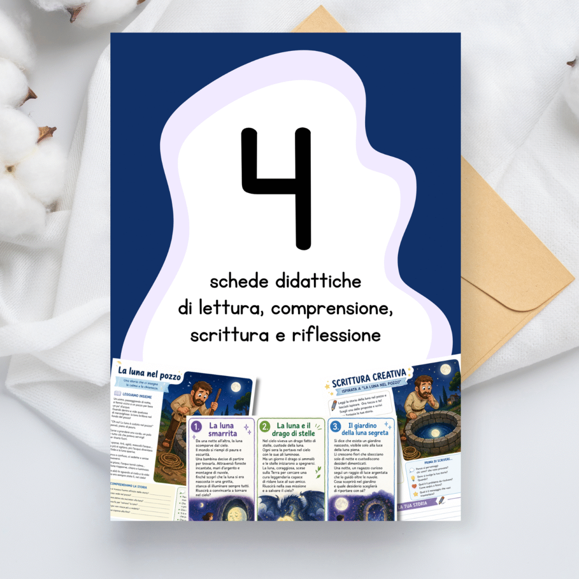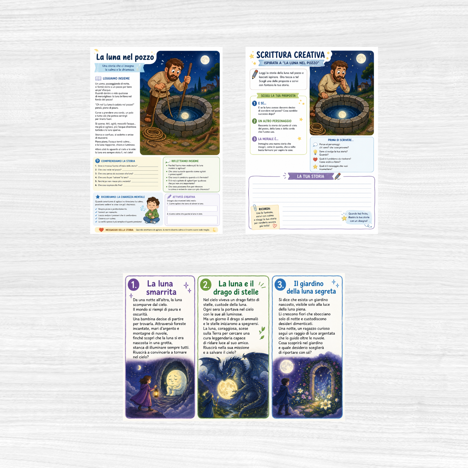 Attività di scrittura creativa: esercizi per stimolare l’immaginazione. Gli studenti potranno inventare nuovi finali, cambiare prospettiva o creare storie ispirate al tema della luna e della calma.