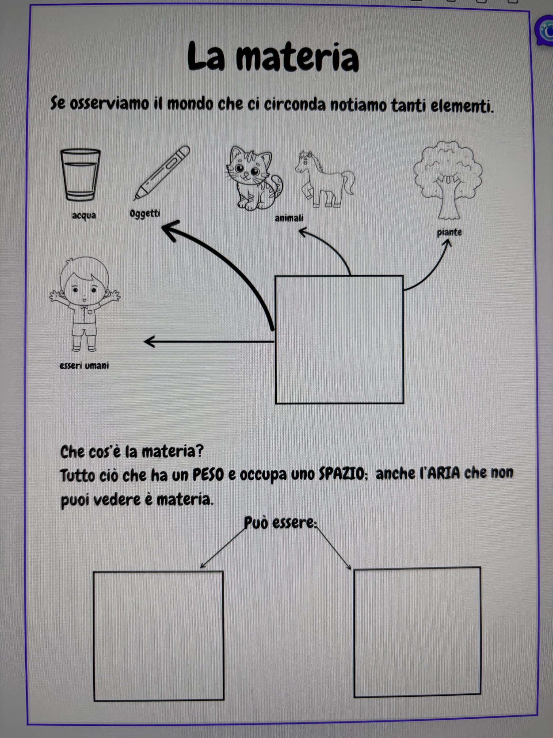 Un lavoro semplice sulla materia per guidare i bambini verso la scoperta della materia: di cosa che fatti gli elementi che ci circondano, compresi noi? Da incollare, ritagliare e colorare per una didattica per tutti.