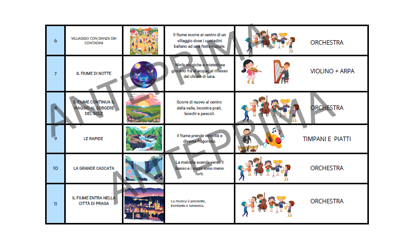 - Schede per seguire la musica: immagini e rappresentazioni che aiutano i bambini a seguire il flusso della musica, comprendendo visivamente i cambiamenti ritmici e melodici, e associando ciascun movimento del fiume con il suono della composizione.