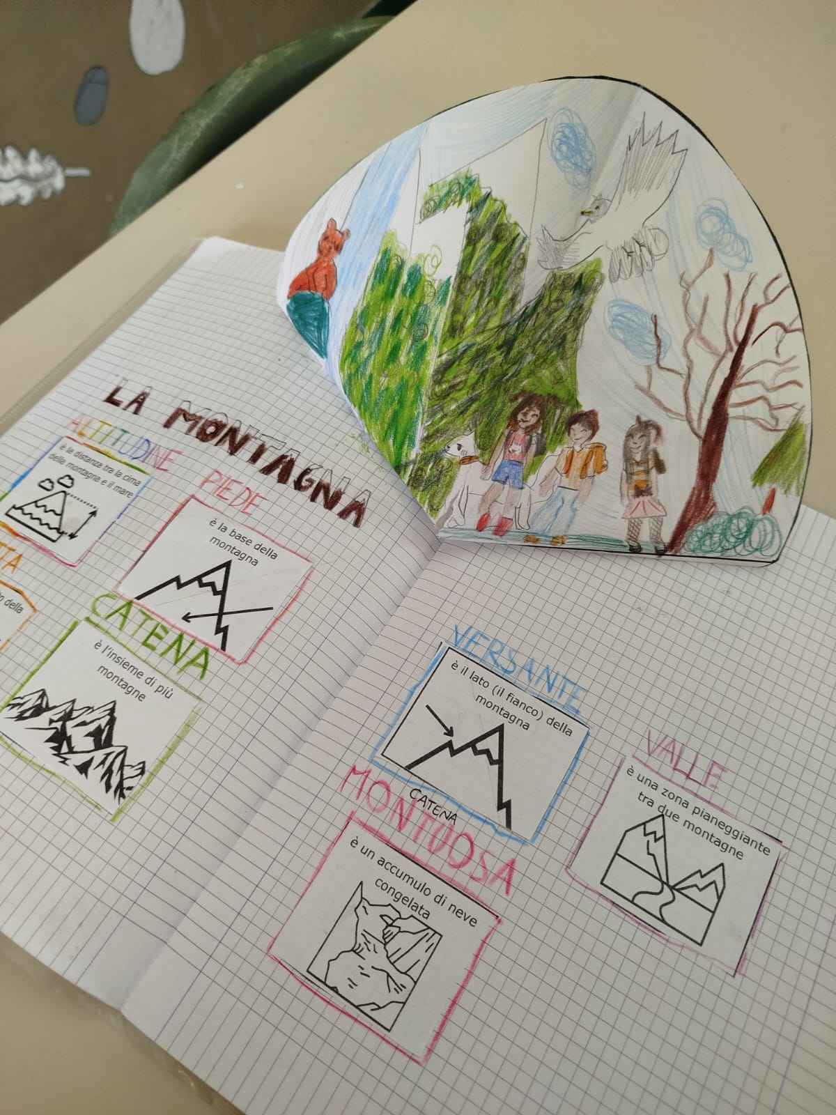 – glossario delle parole importanti (ad ogni immagine i bambini dovranno associare la parola corretta. Es. “si chiama così il fianco della montagna”->VERSANTE).
