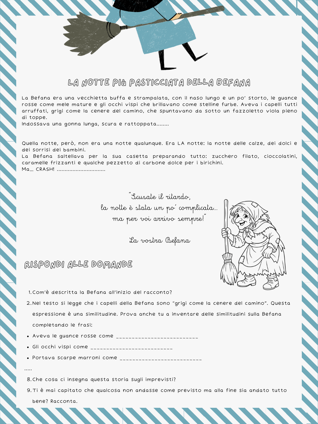 Una storia divertente e piena di suspense sulla Befana che affronta mille imprevisti prima di consegnare dolci e calze. Il testo contiene una parte molto descrittiva, ricca di aggettivi, perfetta per un lavoro sulla Befana, e utilizza similitudini che vengono poi riprese nelle domande a risposta aperta. Ideale per bambini della scuola primaria.